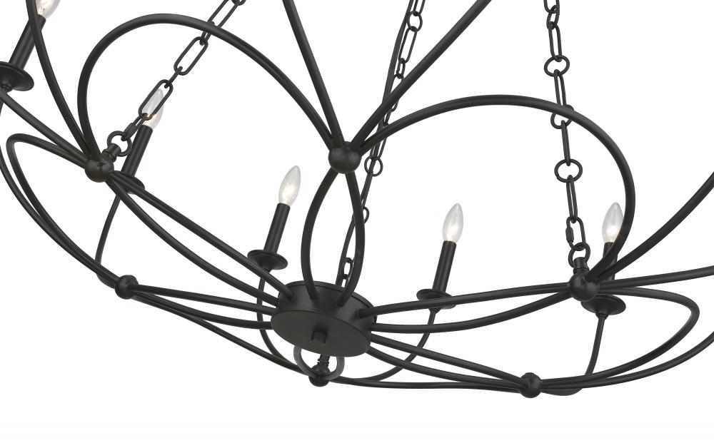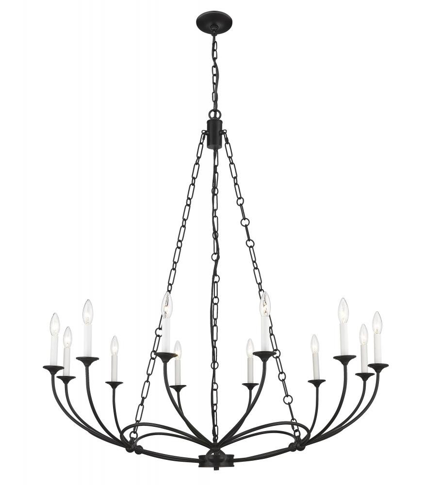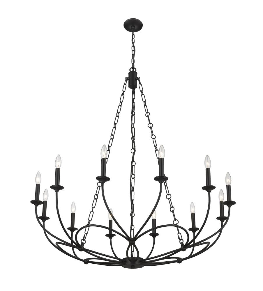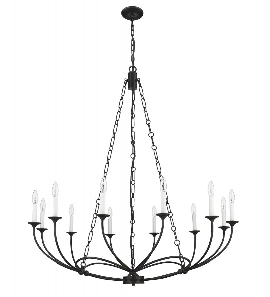 A strikingly theatrical quality reflects in the design of a twelve-light chandelier with a flair toward artistry coupled with energy. From the Arabella Collection, this exquisite fixture maintains a light, symmetrical motif in spite of its bold matte black finish steel construction. A ribbon-like design accents its chicly arched frame with charming candelabra bulb mounts that soften edgy character.