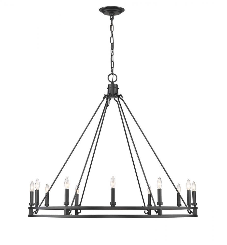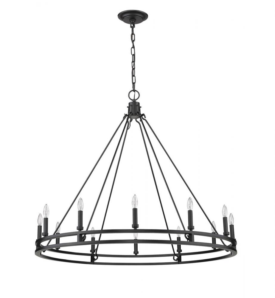 Palatial elegance offers a charming attitude that illuminates a classic custom space. This twelve-light chandelier adopts a dramatic aesthetic with geometric influence, and shows off a gorgeous Modern Matte Black metal ring frame dotted with candelabra bulb mounts.