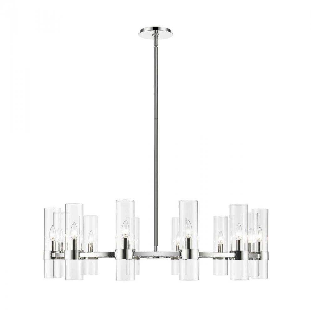 This contemporary twelve-light chandelier from the Datus collection features a slick round silhouette and a sense of simple elegance. Illuminate a foyer, dining area, or main living space with this circular-inspired chandelier featuring solid iron with a sleek polished nickel finish and delicate clear glass cylinders.