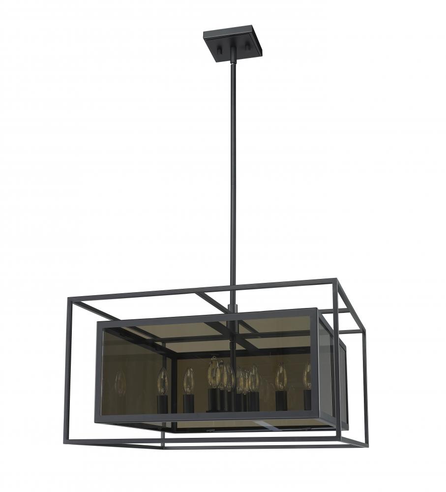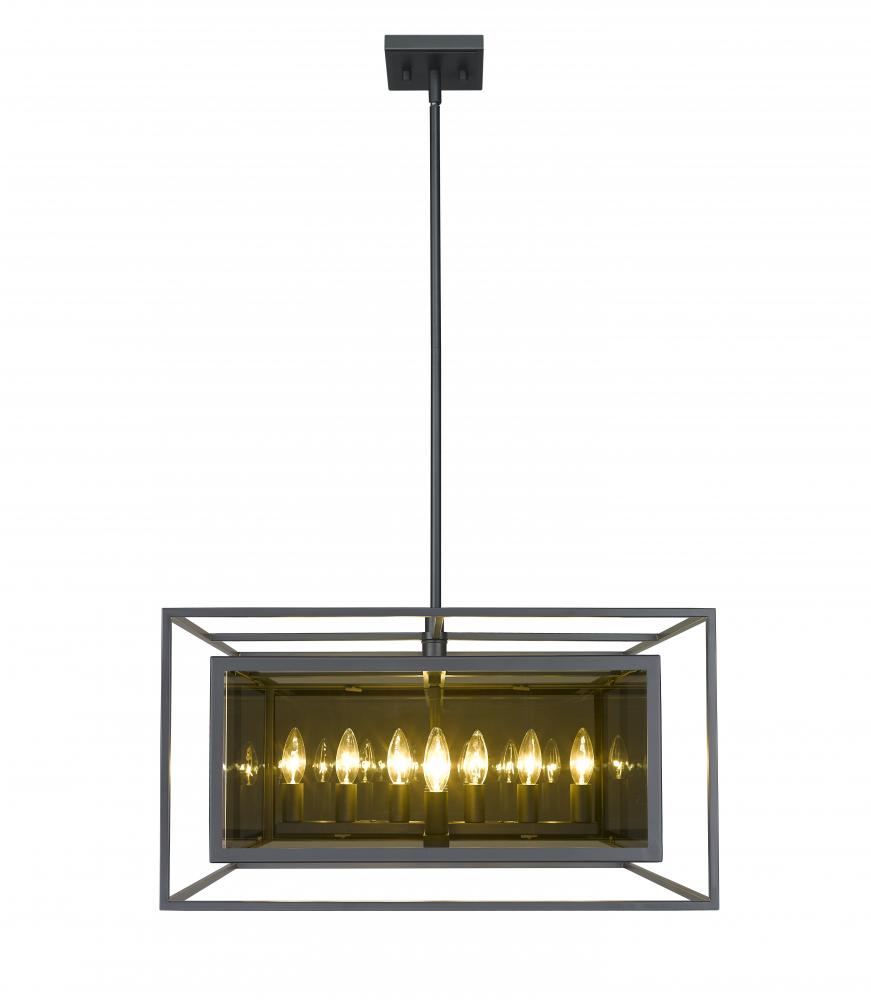 Choose this decadent contemporary twelve-light pendant light for its chic blend of steel and mirror, and a geometric linear silhouette that updates modern living areas including dining rooms, foyers, and main living spaces, and hallways. A double frame made from misty charcoal finish steel joins both clear and smoke glass to deliver a soothing, atmospheric aesthetic with plenty of inspiration. Candelabra bulb mounts create an opportunity to change up the motif and fit into transitional spaces.