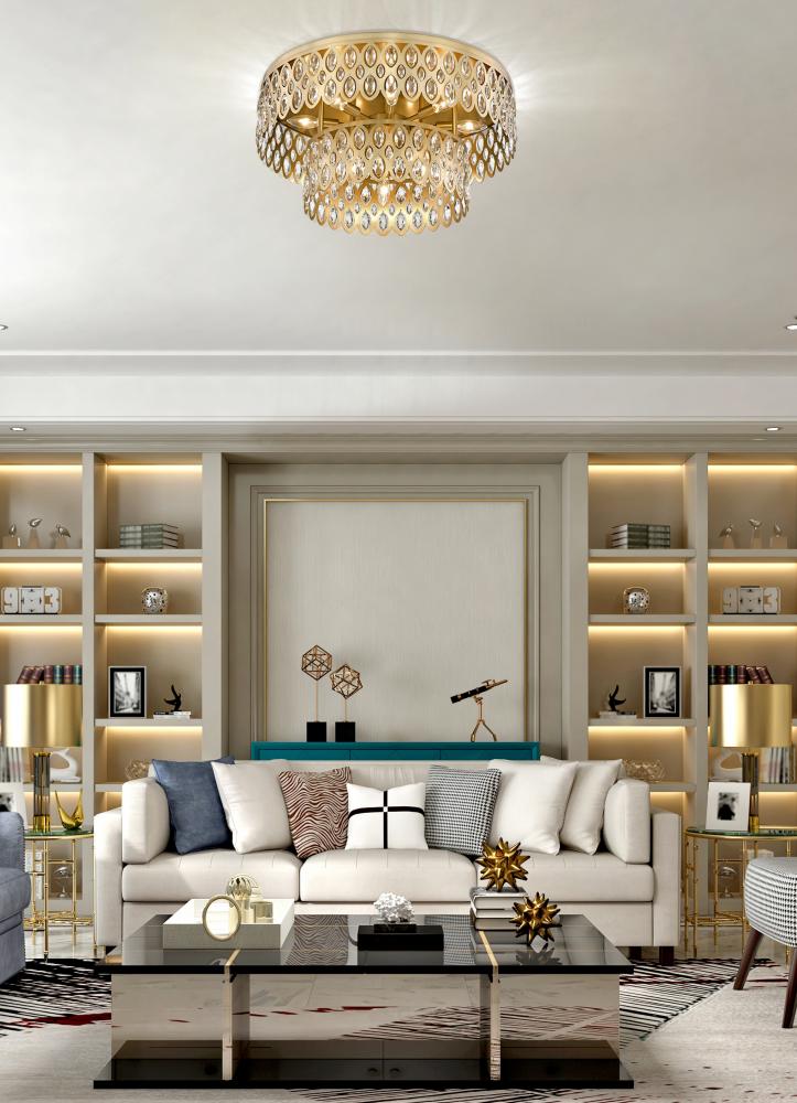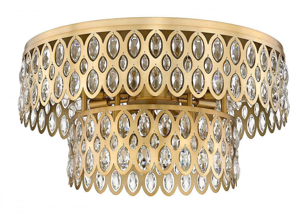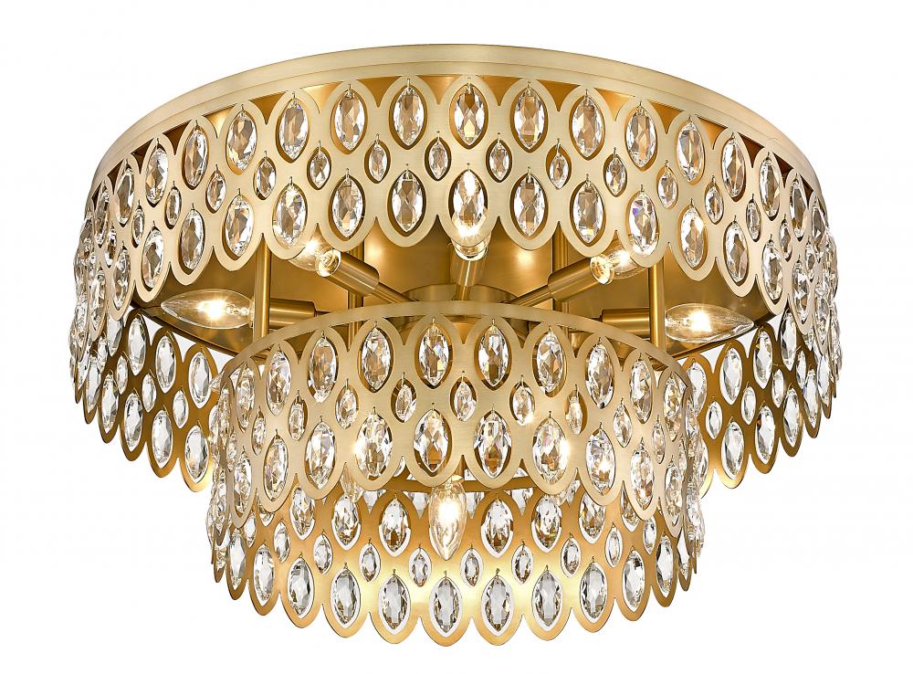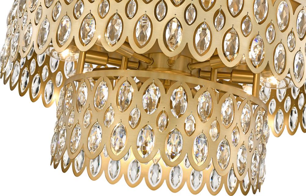 Bring glittering ambiance with the wide tiers of sparkling crystals featured in this modern glam 12-light flush mount ceiling light from the Dealey collection. Designed to make a statement, the piece features two cut-out steel drums in heirloom brass finish, dotted with faceted crystals that gleam and glitter in the light. This gracious fixture delivers the ambiance of a grand chandelier in a fraction of the space, perfect for hard-to-fit spaces.