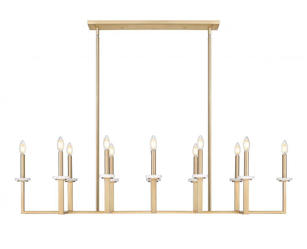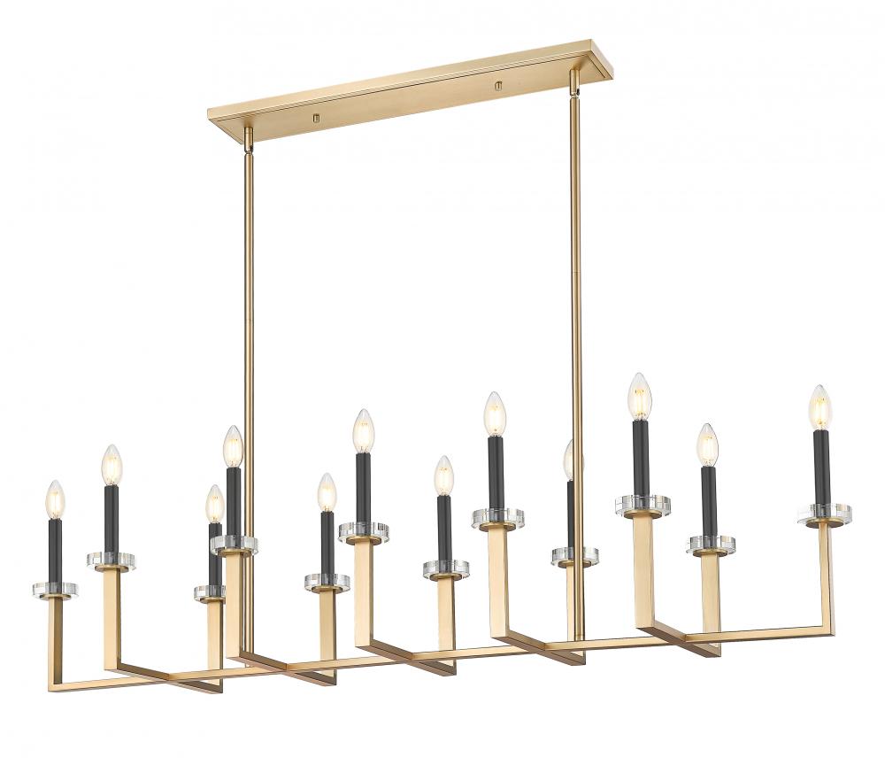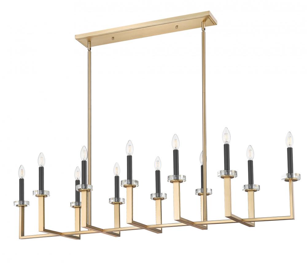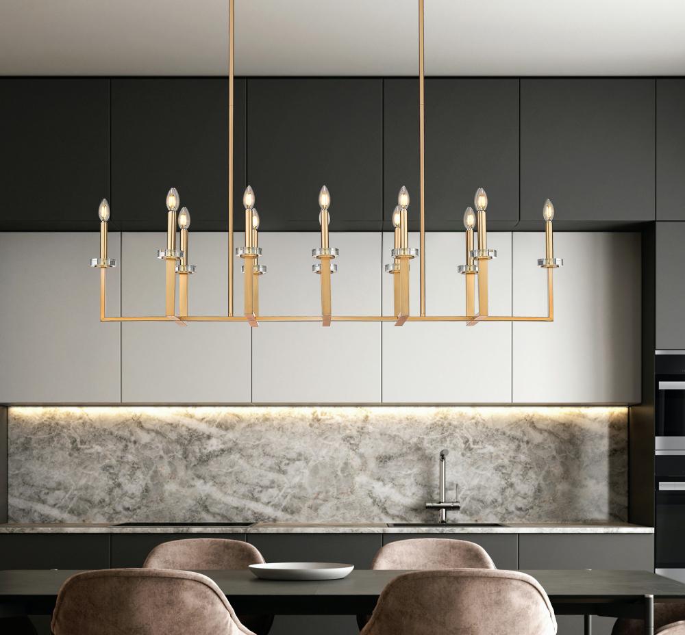 The illumination power of this twelve-light modern gold steel chandelier is second only to its impressive design featuring a perpendicular arrangement of u-shaped holders and a single bar. A superb choice for kitchen islands, dining rooms, and foyers, this fixture delivers strong lighting from candelabra-style bulb mounts accented with charming boboches. Dimming options create disparate lighting levels, ideal for time-of-day differences.