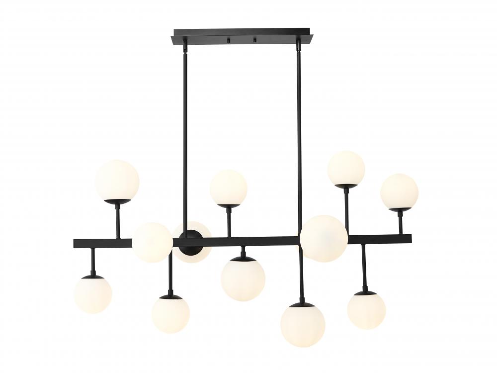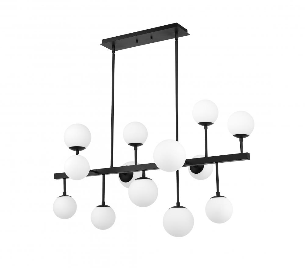 Send visual cues upward to capture a whimsical, charming look in a large entertainment space. Modern styling with strong industrial elements forms a delightful island/billiard light that works in a casual kitchen as well. A linear matte black finish steel frame sets the stage for a festive arrangement of thirteen matte opal glass globe bulbs to create mood-lifting ambiance that lends a hint of space-age personality to this enticing light.