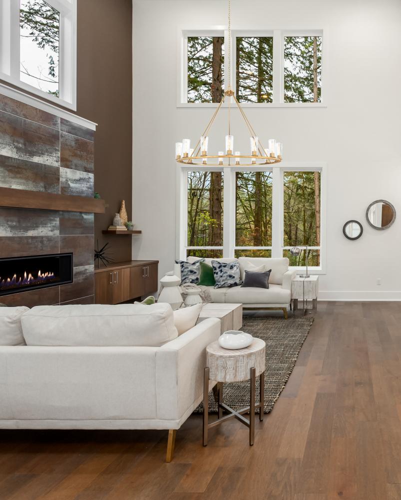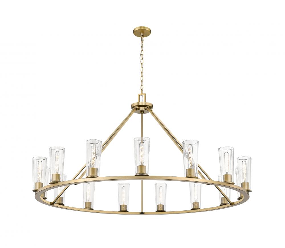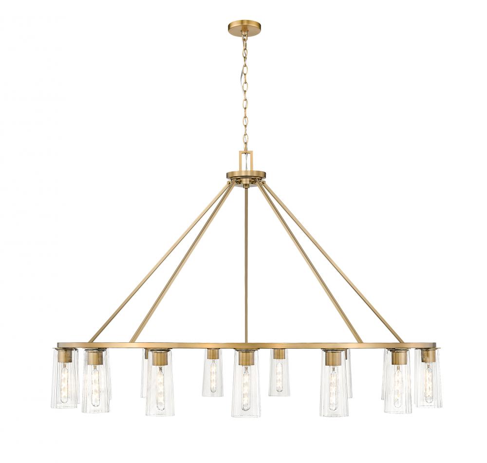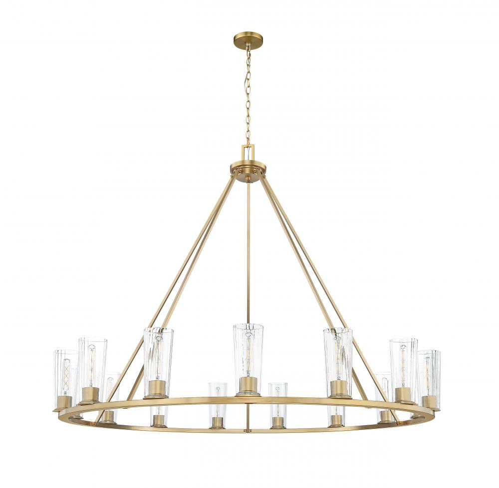 Graceful tapering clear glass shades host individual tube lights to create a sense of delicacy and balance for a modern 15-light chandelier. Ideal for a large dining room or foyer, its a classic ring silhouette with angular rods that create a conical profile. A modern gold finish is rich and sophisticated, adding elevated appeal to its simple silhouette.