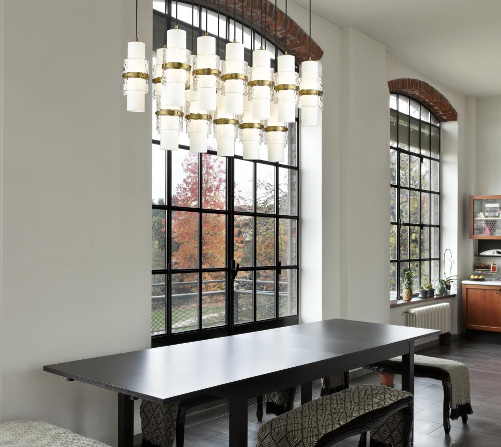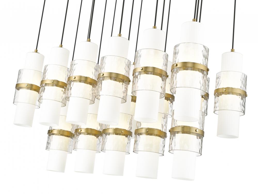 Create rich dimension and depth with the tiered design and linear framework of a modern 17-light chandelier. Three rows of lights create a spectacular display, each with a layered shade that begins with an etched opal glass cylinder, adds clear textured glass and is secured with a decorative cuff in a rich modern gold finish to match its canopy. Braided cloth cord covers complete the look with fresh elegance, perfect for an island pendant in your kitchen or over a dining table.