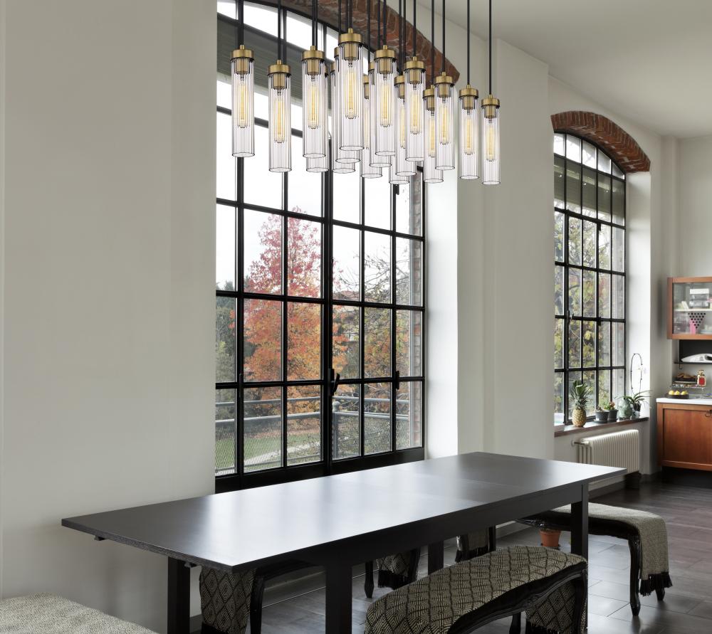 Customize a modern space through the organic artistry of lighting, choosing this 17-light chandelier to highlight an island, bar, or living area. Delicate fluted glass shades arrange in a minimalist silhouette with maximal impact, offering an organic perspective. Bold rubbed brass finish metal comes to life in a sleek canopy when bulbs are illuminated, creating a noticeable contrast.