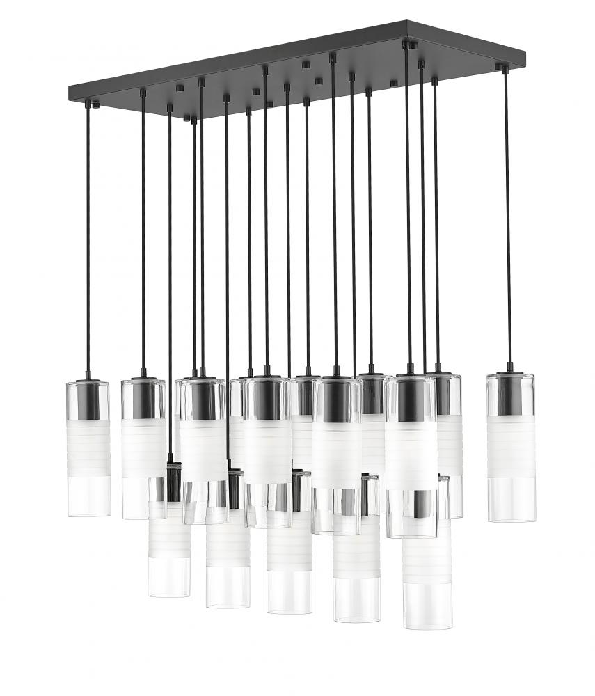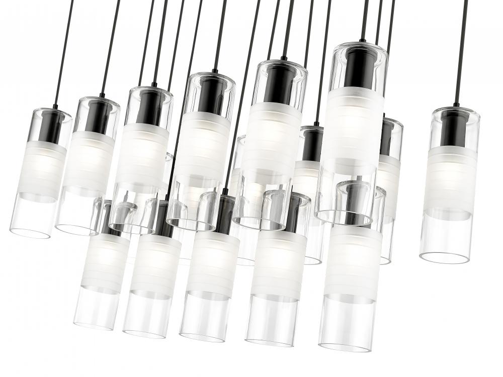 Two tiers create a staggered effect for the individual suspended lights featured in a modern 17-light linear chandelier. From the Alton collection, its deceptive simplicity is enhanced with clear and frosted glass elements and braided clothe cords that effect a fresh, tailored ambiance perfect for sophisticated spaces. Its housings and rectangular canopy receives matte black finish, instilling a casual but refined sensibility in any space.