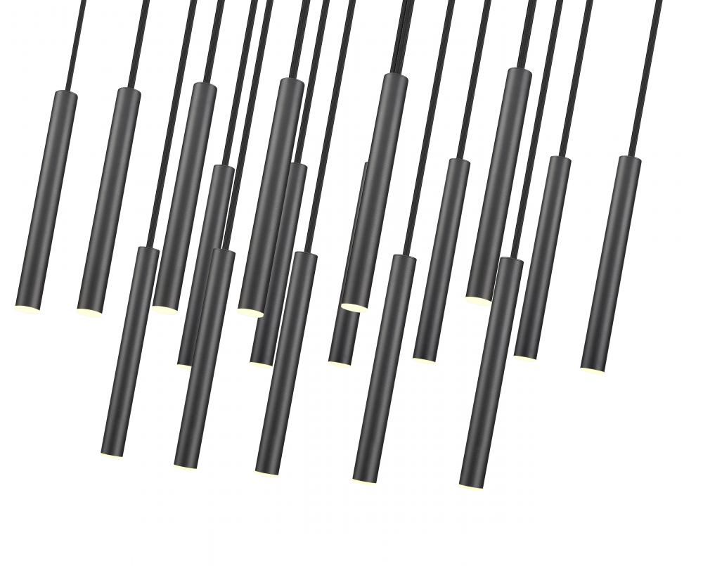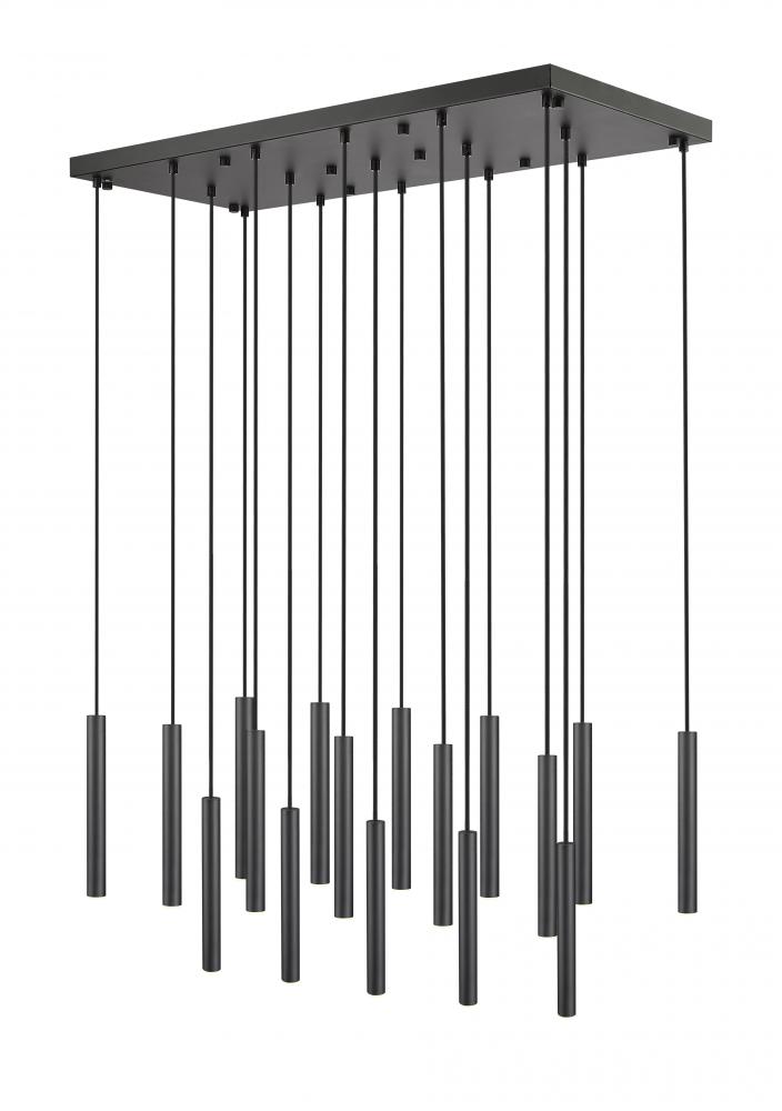 An eye-catchingly simple canopy anchors the delicate, staggered lights featured on this modern 17-light linear chandelier. A refined addition over a living or dining room setting, it features a matte black finish for maximum contrast and depth. Lights are slim and staggered in height, featuring integrated LEDs that dim for a custom ambiance. Its the perfect choice over a grand foyer or sophisticated dining room.