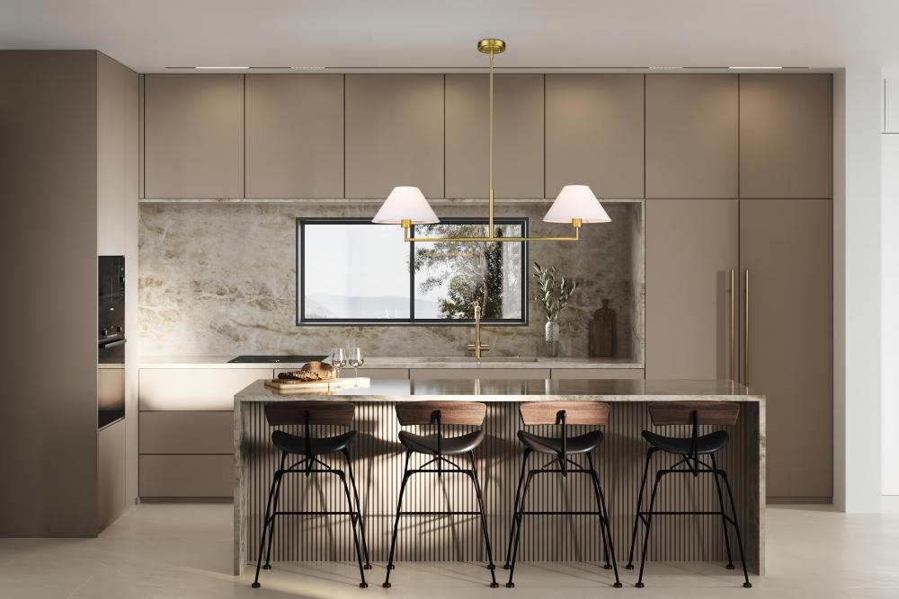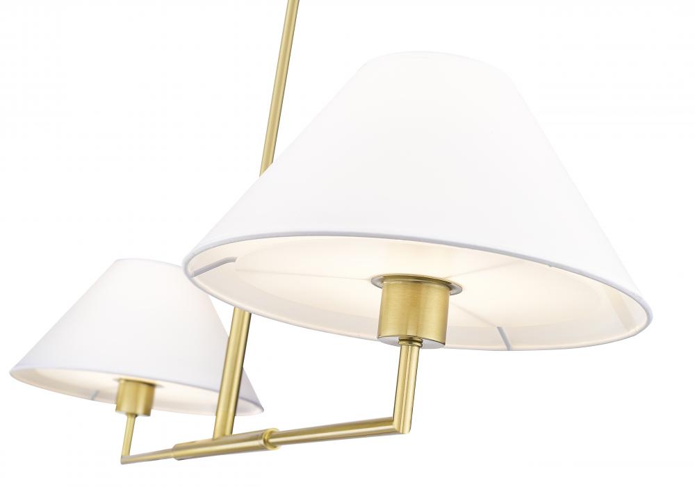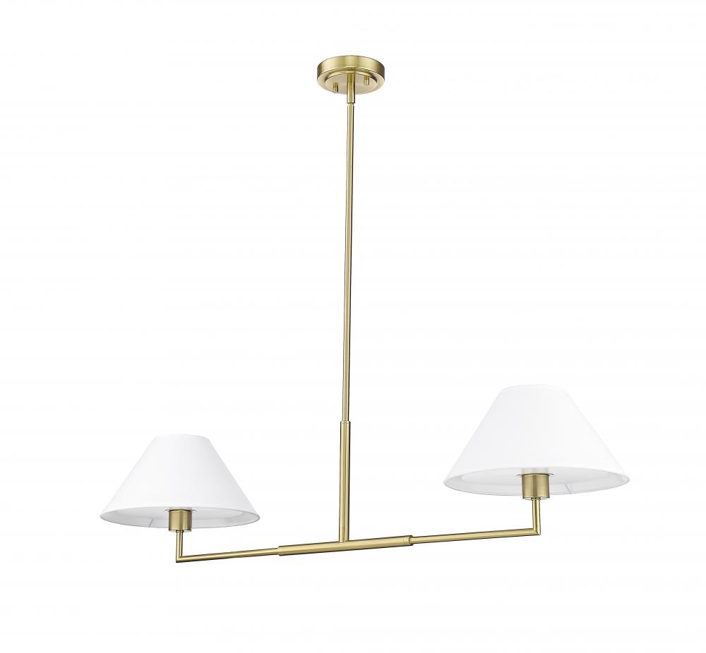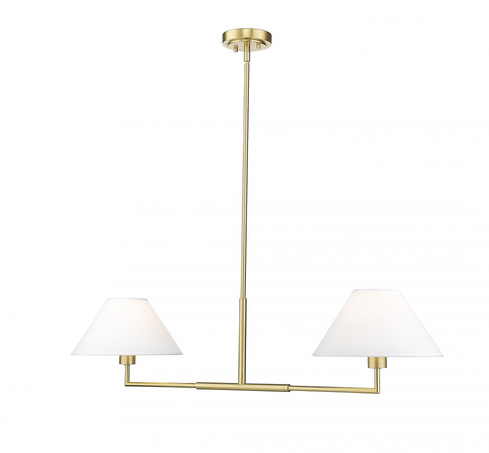The power of modern simplicity is highlighted in a chic two-light linear chandelier thats equally impactful over a kitchen island as in your bedroom or living area. Its clean lines are accentuated with a warm luxe gold finish over steel construction, while a pair of white linen empire shades are beautiful and timeless in any room. Casting inviting illumination for tasks and ambiance, this chandelier is a stylish fit in myriad spaces.