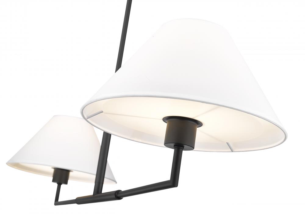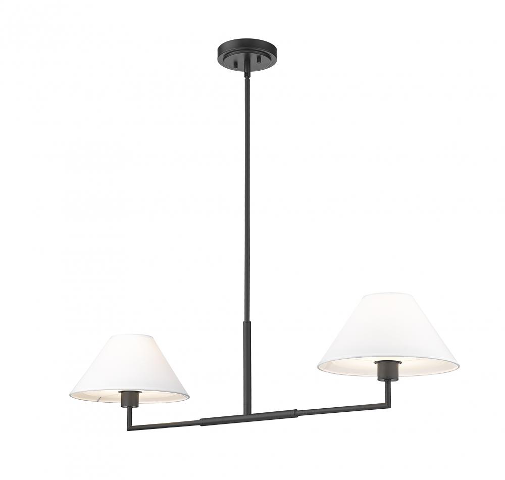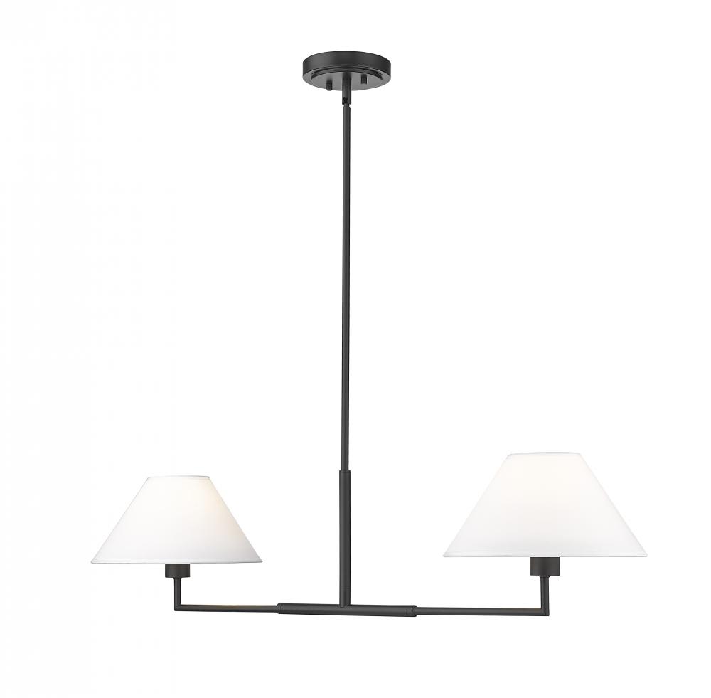 The power of modern simplicity is highlighted in a chic two-light linear chandelier thats equally impactful over a kitchen island as in your bedroom or living area. Its clean lines are accentuated with a crisp matte black finish over steel construction, while a pair of white linen empire shades are beautiful and timeless in any room. Casting inviting illumination for tasks and ambiance, this chandelier is a stylish fit in myriad spaces.
