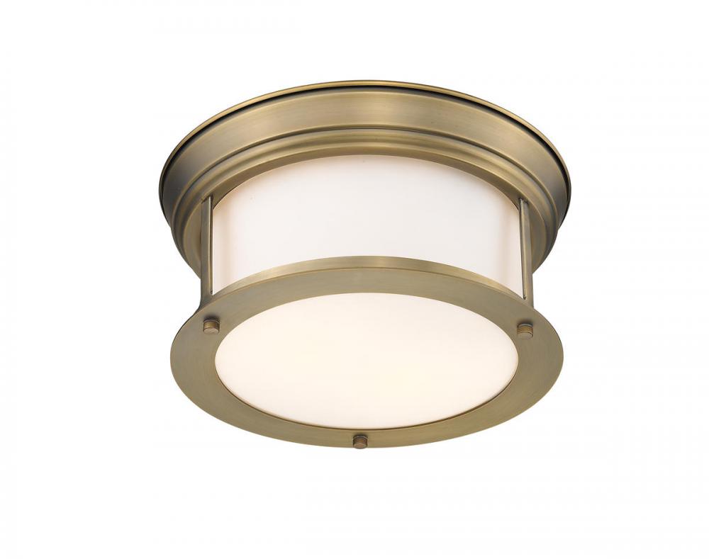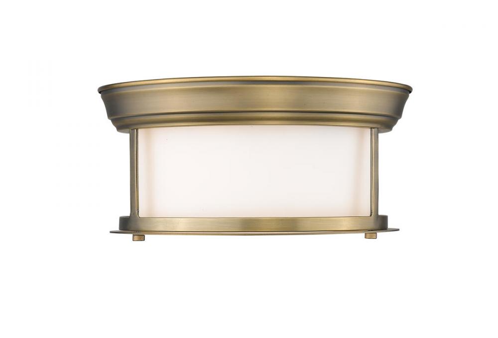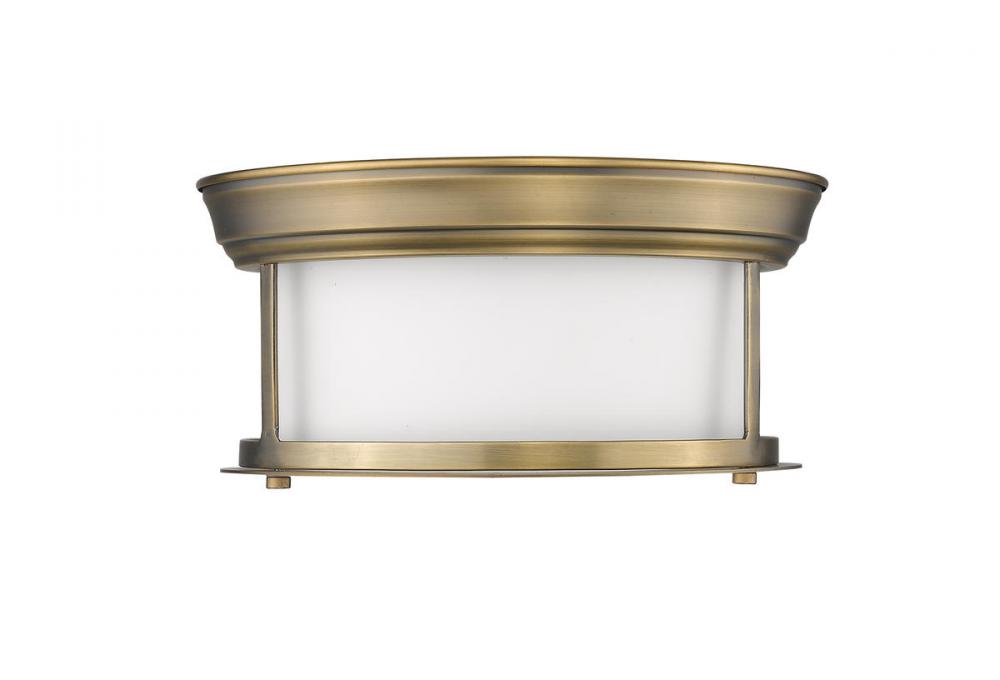Let classic design create sophistication in a transitional living space. A wide cylindrical clear seedy glass shade nested in an open metal frame with a sleek Heritage Brass finish places this two-light flush mount ceiling light in a class of its own.