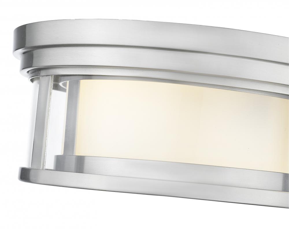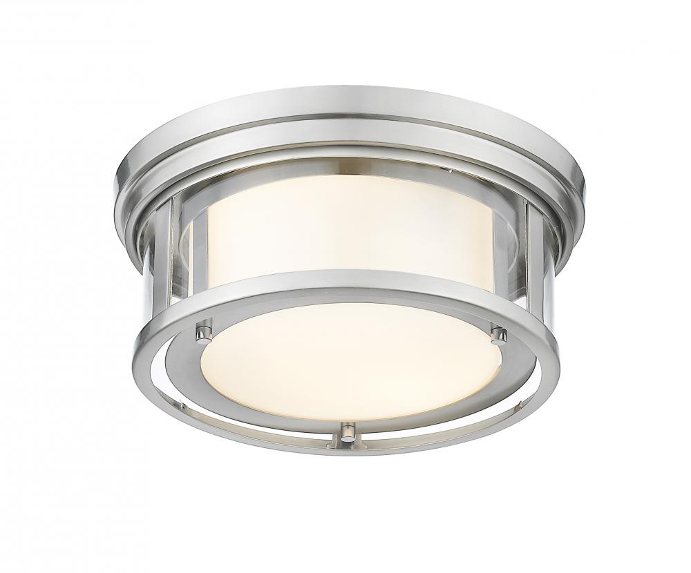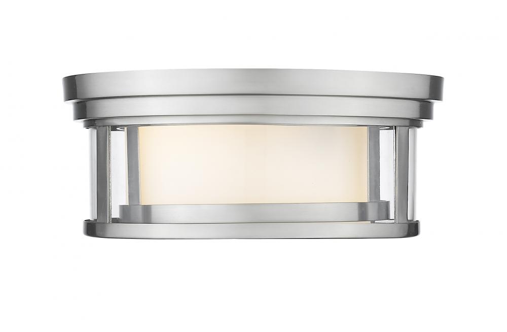 Give your dining room or bedroom a chic, sophisticated update. This beautiful, brushed nickel flush mount ceiling fixture features two glowing bulbs beneath a delicate, glass shade thats white on the inside and clear on the outside. An exquisite lighting option to highlight your refined sense of style.