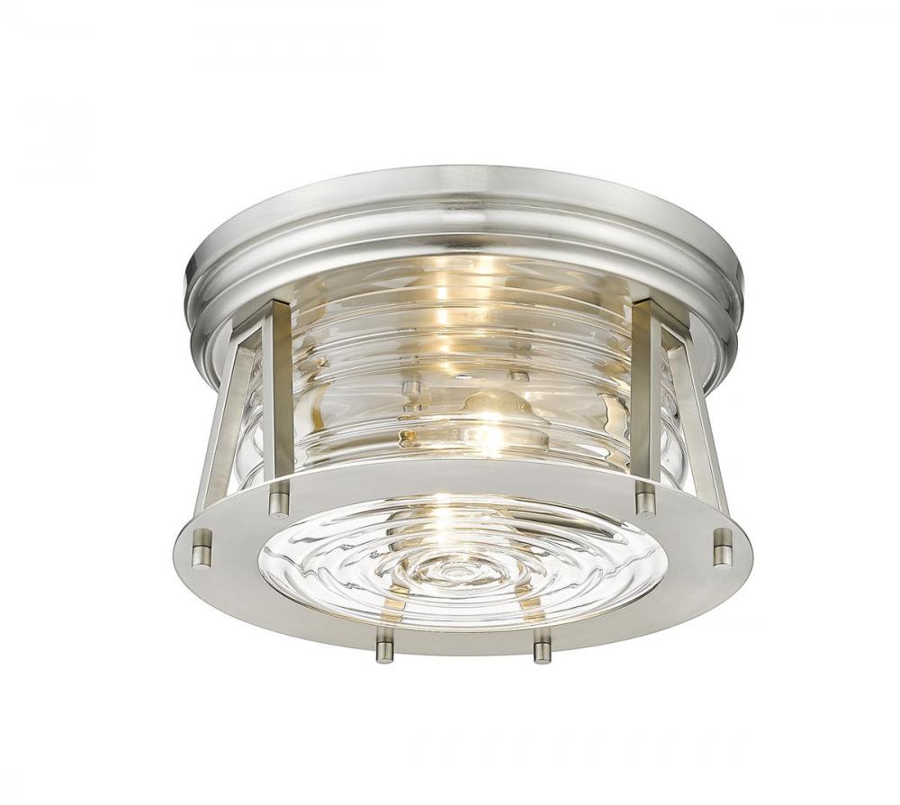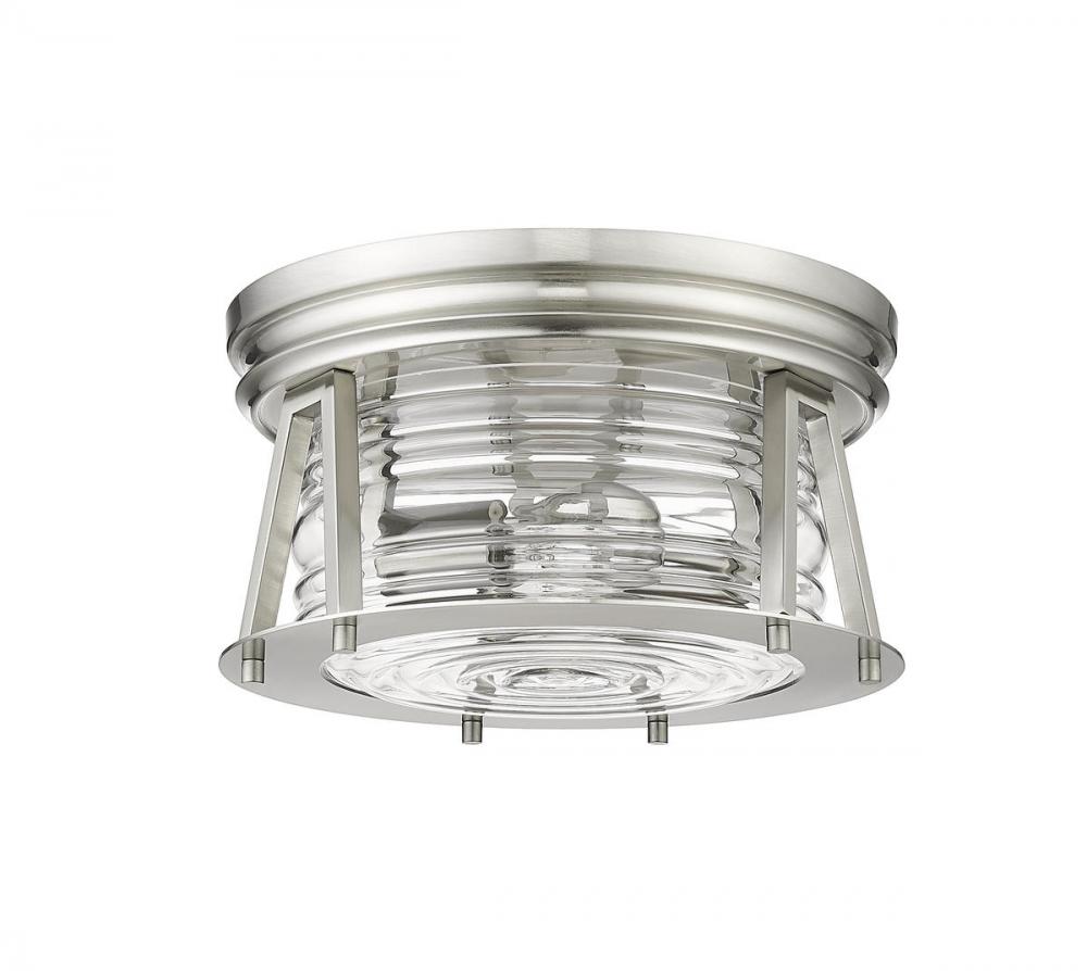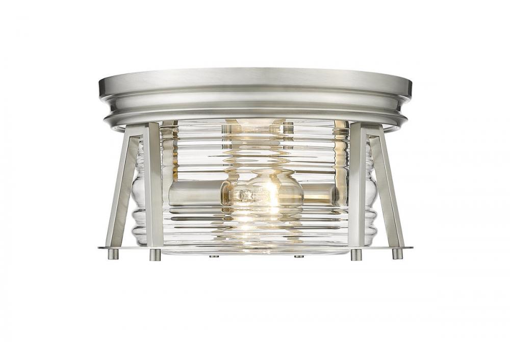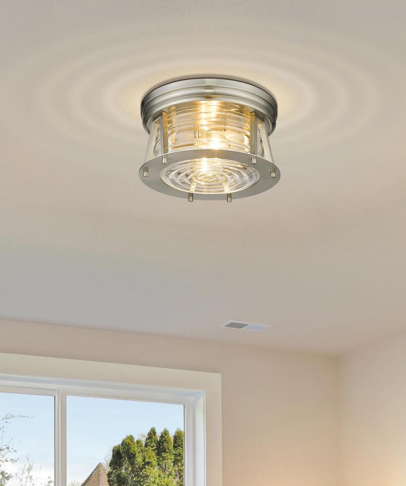 Indulge in a storied historical theme as you outfit a modern space with ambient light fixtures. Aptly named from the Cape Harbor collection, this delightful two-light flushmount ceiling light offers a tribute to authentic nautical fare from coastal Cape Harbor in North America, combining Art Deco flavor with a linear concept. This light offers an angled brushed nickel finish frame and canopy that nestles ribbed clear glass, delivering an aesthetic that moves from industrial to modern to coastal.
