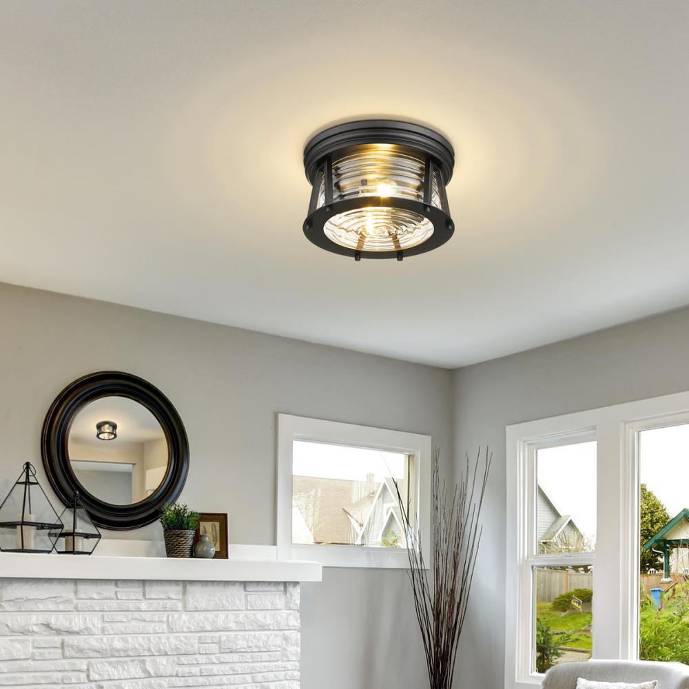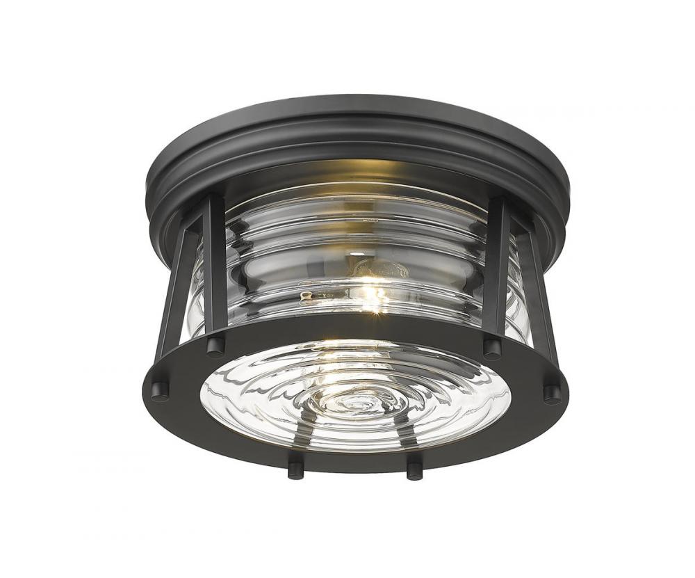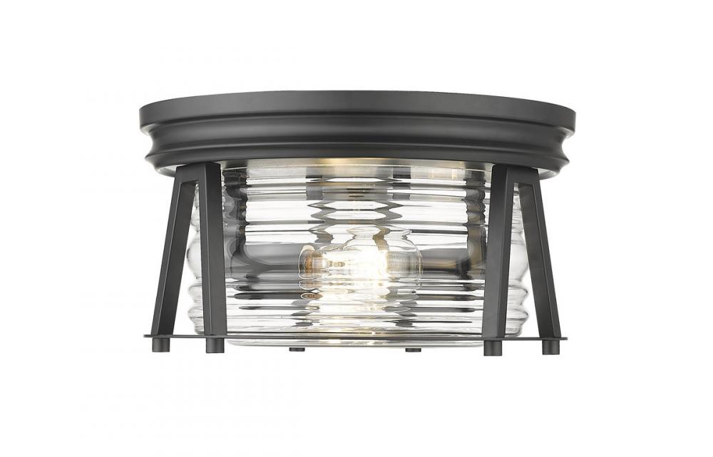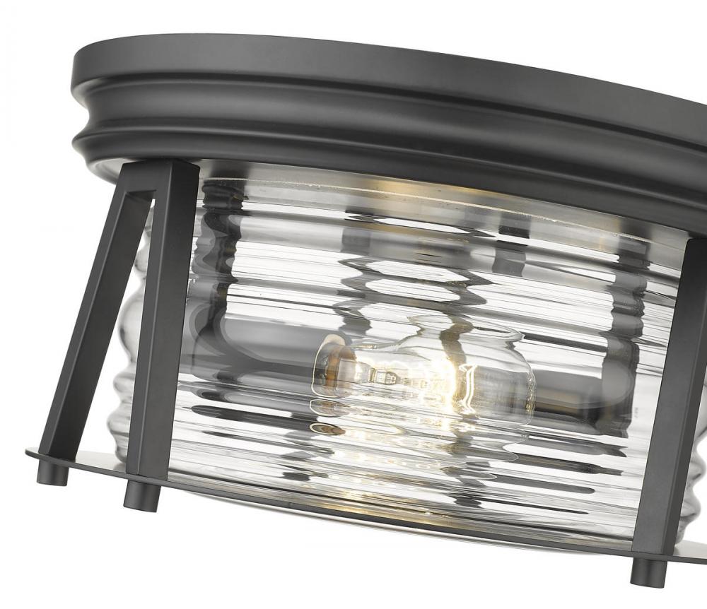 Indulge in a storied historical theme as you outfit a modern space with ambient light fixtures. Aptly named from the Cape Harbor collection, this delightful two-light flushmount ceiling light offers a tribute to authentic nautical fare from coastal Cape Harbor in North America, combining Art Deco flavor with a linear concept. This light offers an angled matte black finish frame and canopy that nestles ribbed clear glass, delivering an aesthetic that moves from industrial to modern to coastal.