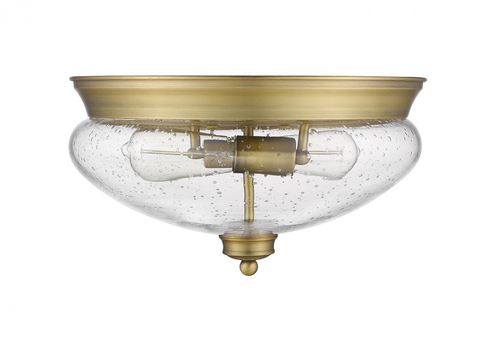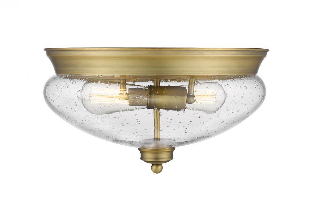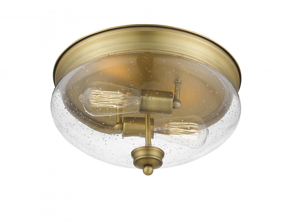 Traditional schoolhouse silhouette meets contemporary sleek lines in this two-light flush mount lighting fixture. The clear seedy vintage inspired globes harken to an old west style while the charming heritage brass embraces a classic look.