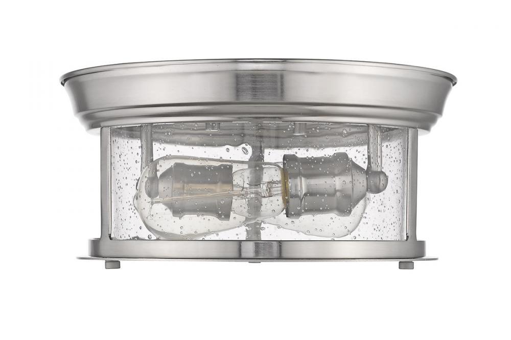 Cool industrial ambiance offers a stylish look to transitional spaces in need of functional, fashionable fixtures. With gorgeous Brushed Nickel finish metal providing a circular cage-like frame and a wide cylindrical clear seedy glass shade completing its visual package, this two-light flush mount ceiling light wraps up a custom kitchen or living area design.