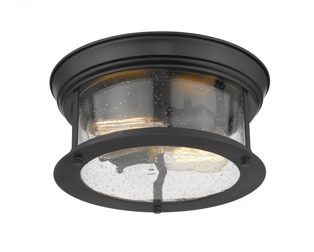 Cool industrial ambiance offers a stylish look to transitional spaces in need of functional, fashionable fixtures. With bold Matte Black finish metal providing a circular cage-like frame and a wide cylindrical clear seedy glass shade completing its visual package, this two-light flush mount ceiling light wraps up a custom kitchen or living area design.