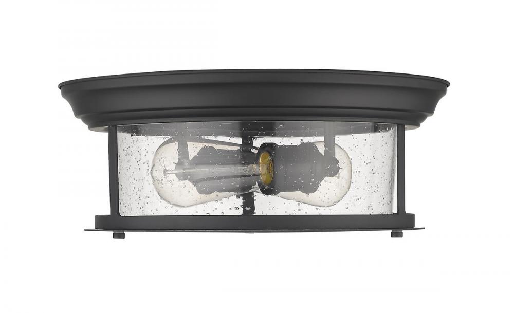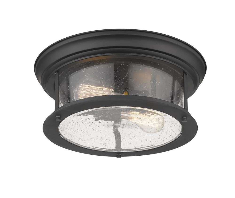 Cool industrial ambiance offers a stylish look to transitional spaces in need of functional, fashionable fixtures. With bold Matte Black finish metal providing a circular cage-like frame and a wide cylindrical clear seedy glass shade completing its visual package, this two-light flush mount ceiling light offers a focal point in a redesigned space devoted to carefree living.