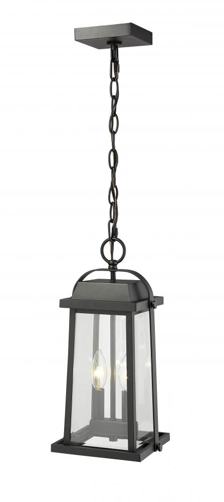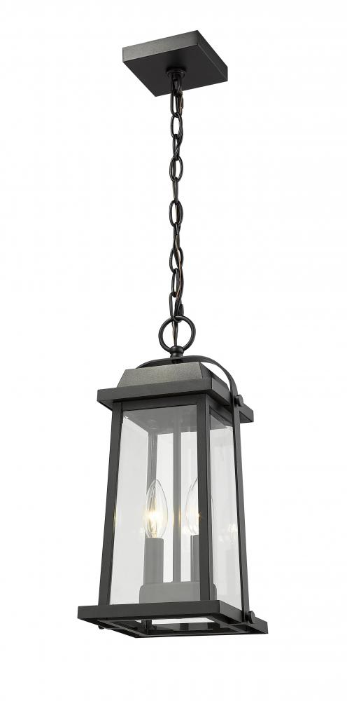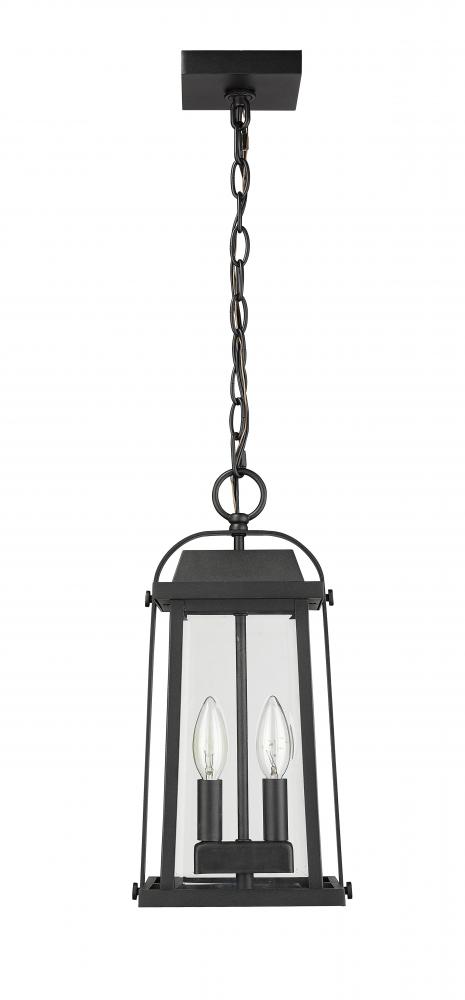 Illuminate a covered patio or porch with the classic flair of this lantern-style outdoor hanging light. Featuring two candelabra lights within, the pendant is complete with a black finish and clear beveled glass for optimal illumination.
