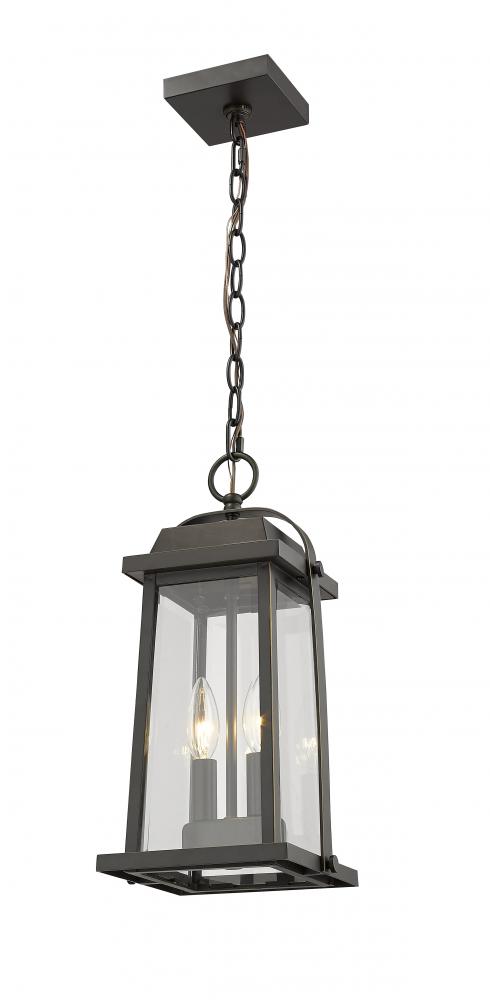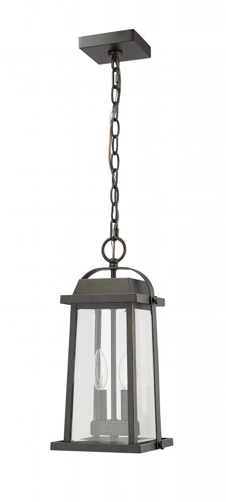 Illuminate a front porch or covered back patio with this charming outdoor hanging light. With a classic lantern silhouette and inviting oil rubbed bronze finish, the pendant is complete with two lights tucked behind clear beveled glass.