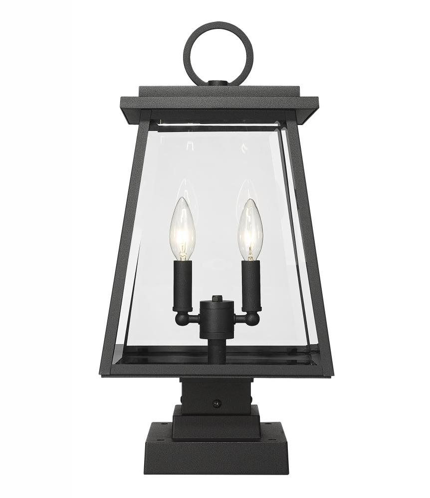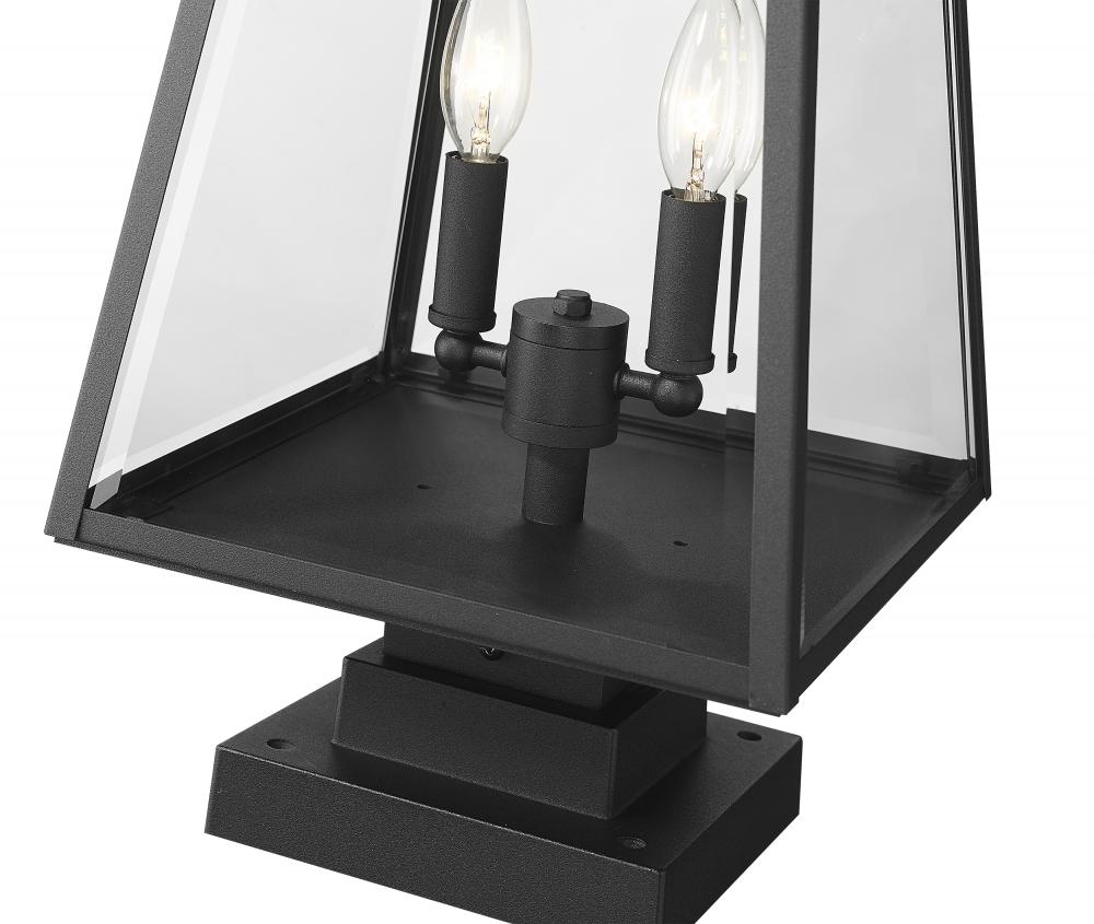Indulgent village nautical charm returns to a storied early 20th Century vibe as it creates elegance in a garden or walkway space. From the Broughton collection, this two-light outdoor pier-mounted fixture offers construction of sleek black aluminum and clear beveled glass panels on its lantern-style shade. Charming candelabra bulb mounts and a crisp layered base seal the deal on a tasteful look.