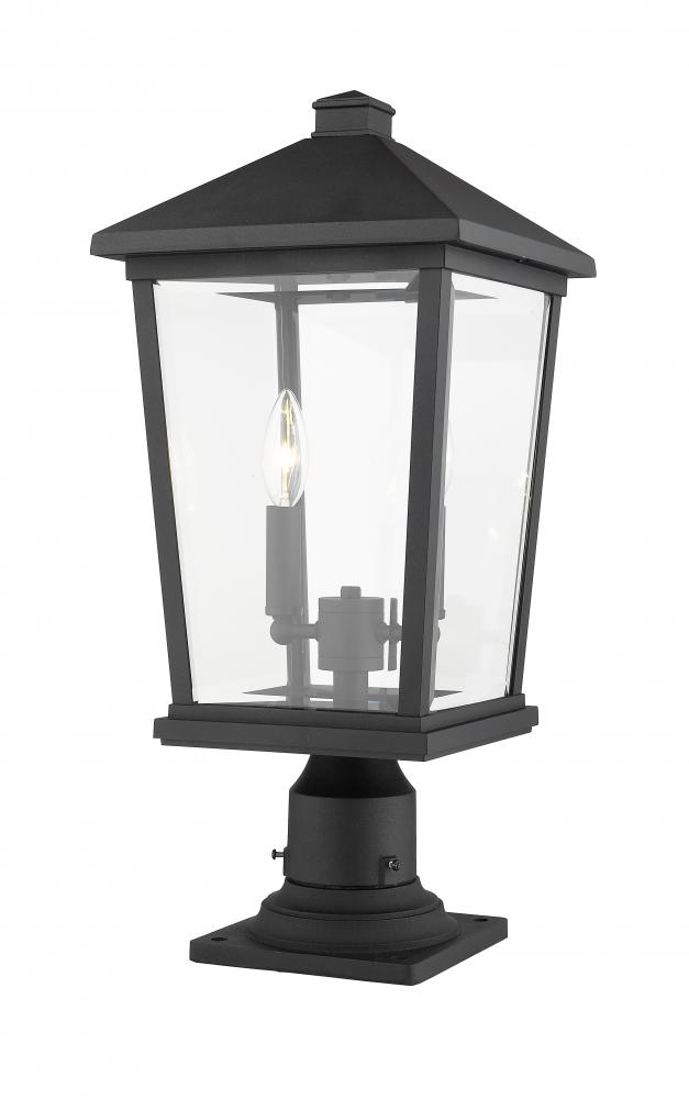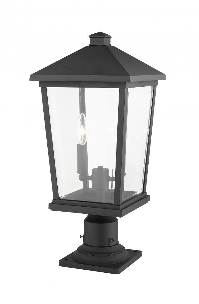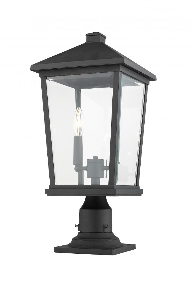 Sleek design makes way for a tasteful accent while illuminating exterior walkways and patio areas. This black post light offers a charming village motif and a candelabra base with bulb sockets for two lights.