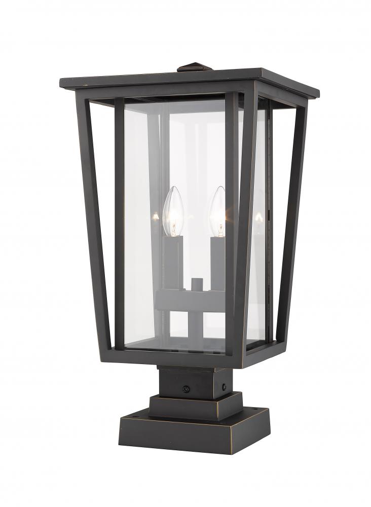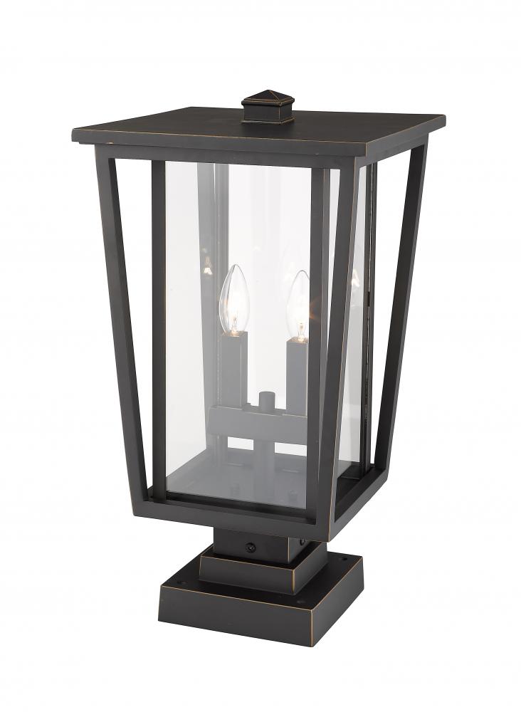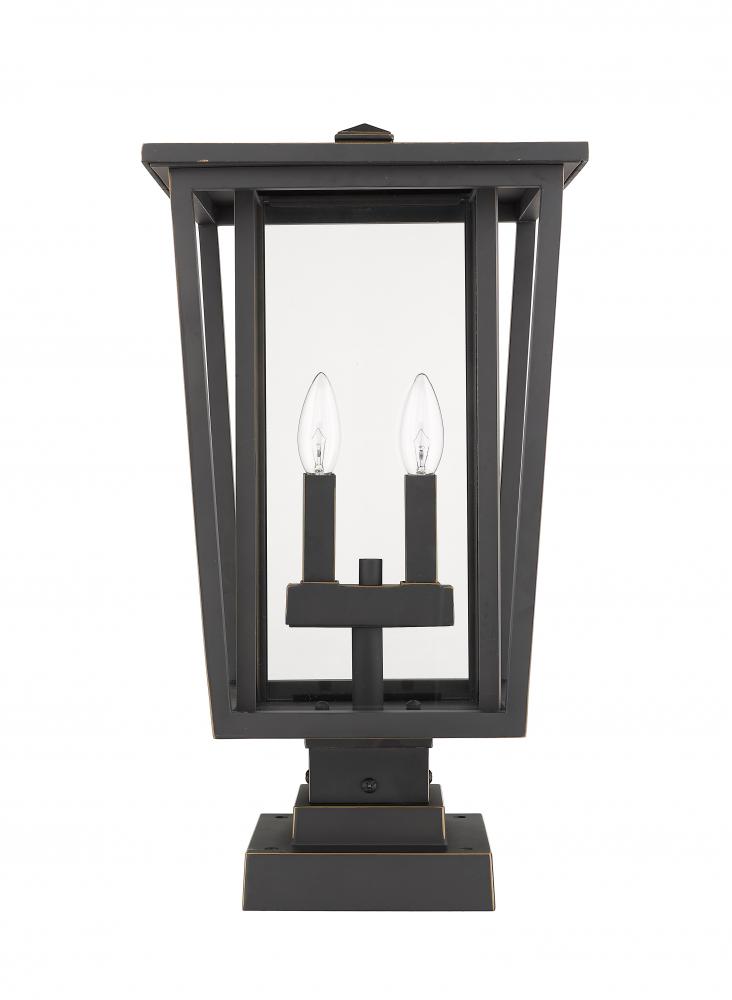 Sophisticated linear design embellishes the character of this outdoor post light. Feel the warm rich vibe of a rubbed bronze finish body that highlights sweet candelabra-style bulb bases behind pristine glass.