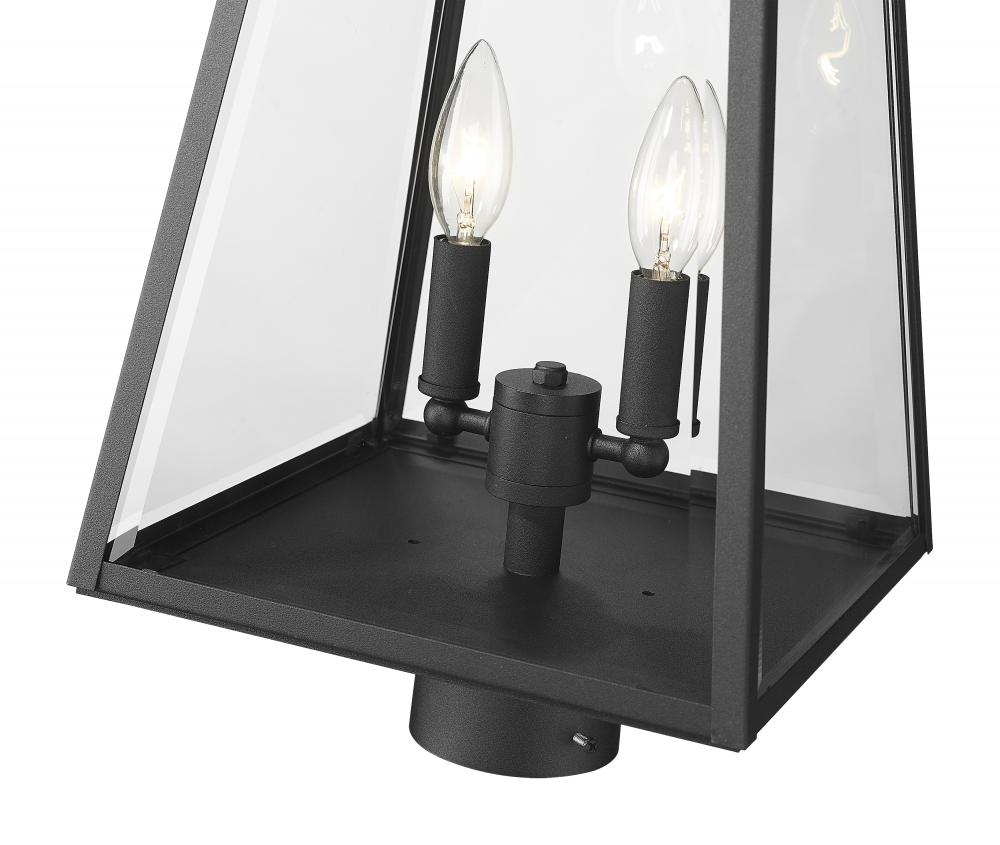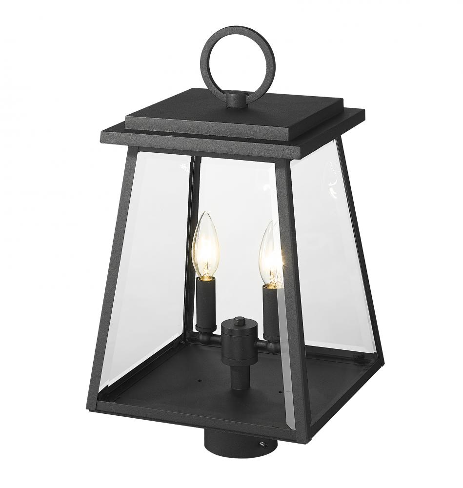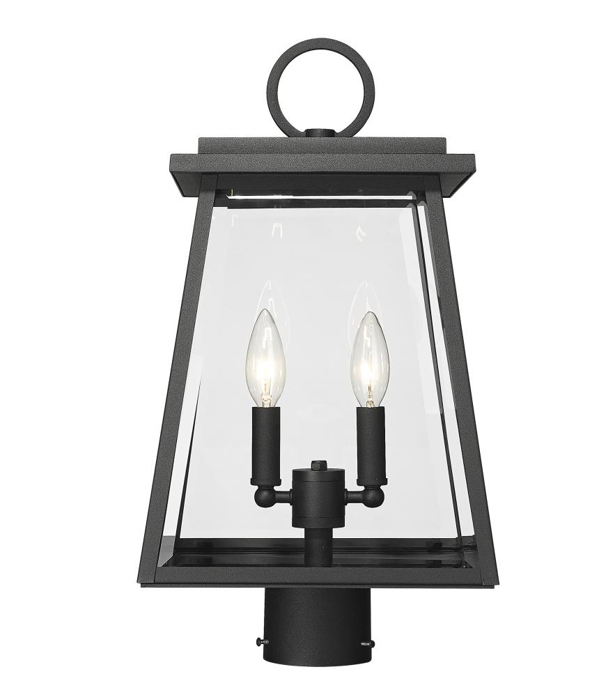 A compelling addition to exterior walkways or gardens, this light element offers a repurposed version of nautical village decor. From the Broughton collection, this two-light outdoor post mount fixture offers construction of sleek black aluminum and clear beveled glass panels on its lantern-style shade. Charming candelabra bulb mounts seal the deal on a tasteful look.