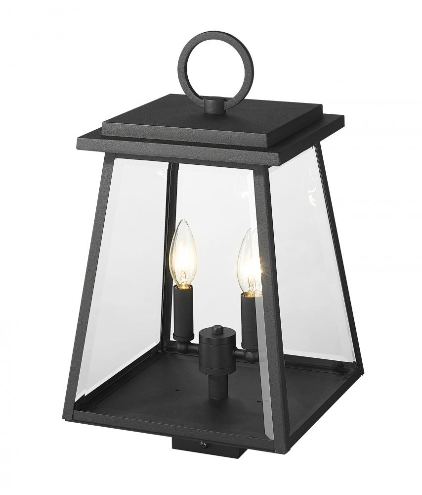 An endearing tribute to village nautical style creates an impressive update to exterior lighting. From the Broughton collection, this two-light outdoor post-mount fixture offers construction of sleek black aluminum and clear beveled glass panels on its lantern-style shade. Charming candelabra bulb mounts seal the deal on a tasteful look.