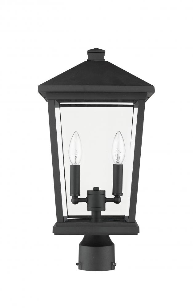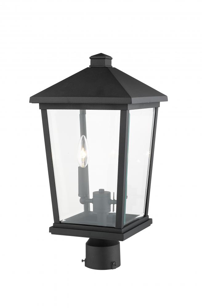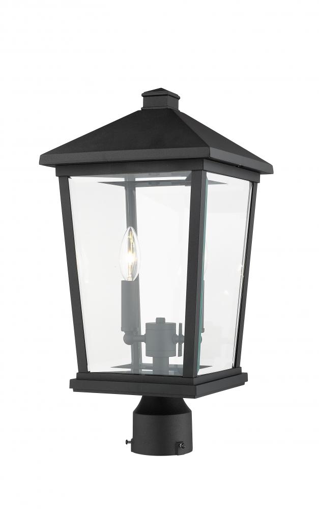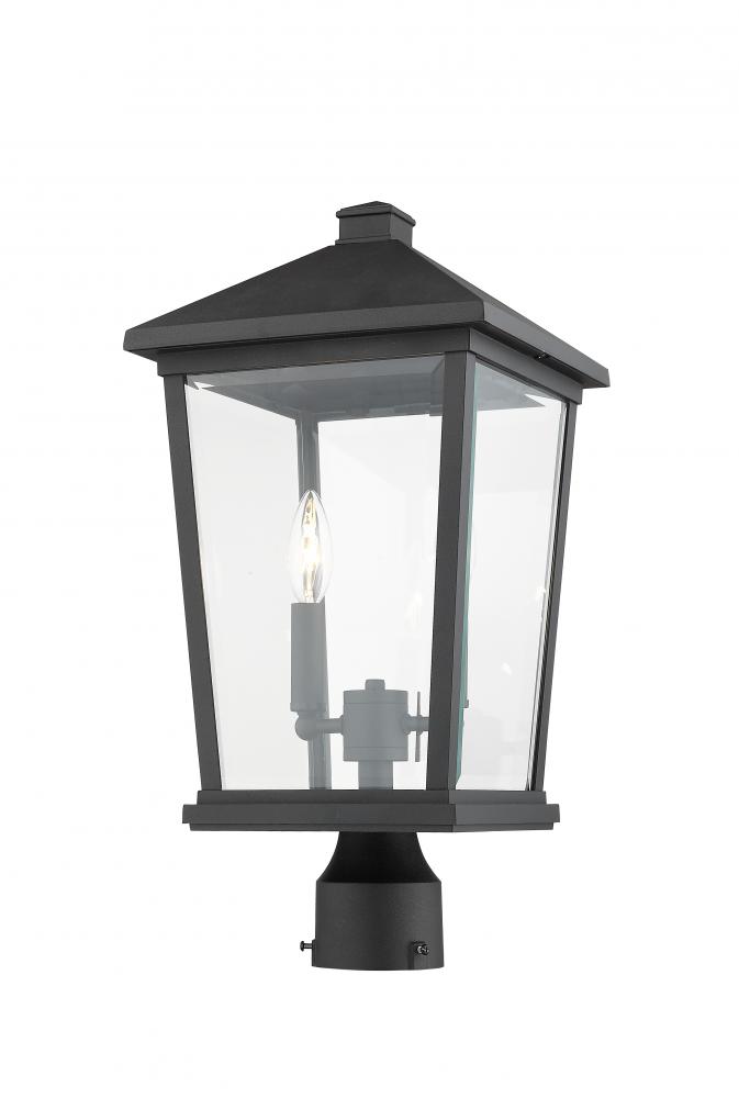 This charming outdoor post lantern shows off a custom designed exterior walkway or garden space. Soak up the nostalgic appeal of a village theme with a black finish frame, clear beveled glass panels, and sweet candelabra-style bulb bases inside.