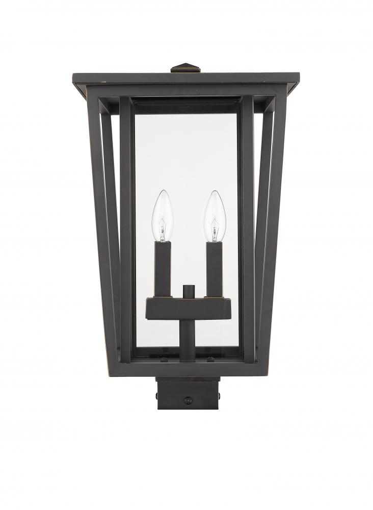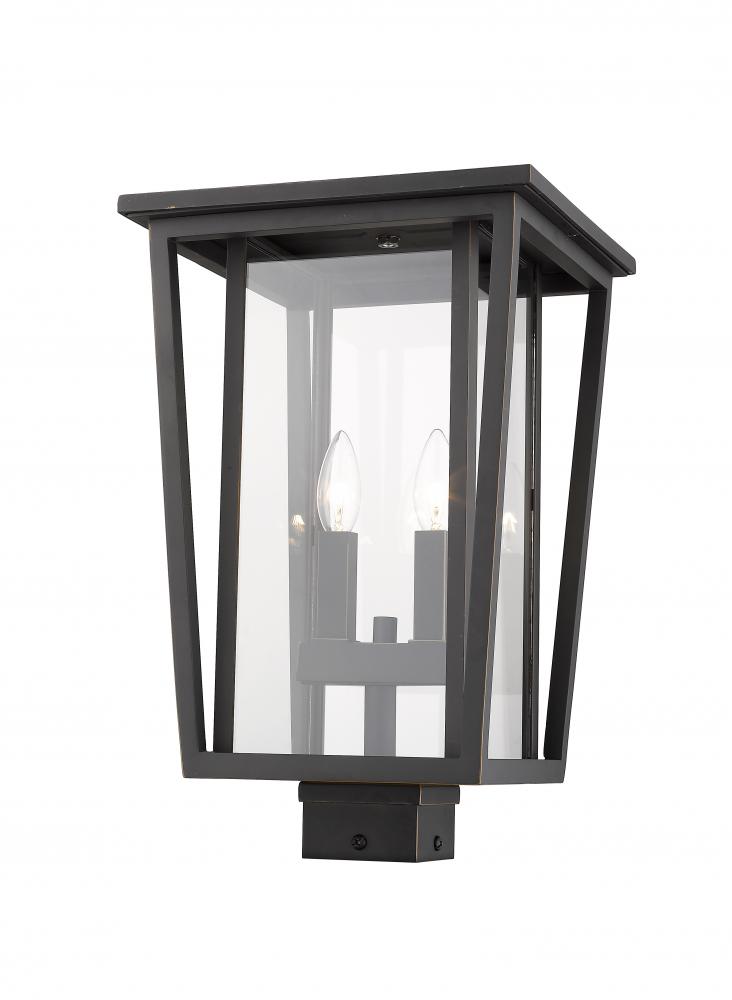 Embrace geometry with a touch of traditional softness. This rubbed bronze finish post lantern blends charming candelabra-style bulb bases with clear glass and a contrasting body, adding a sophisticated feel to a garden or landscaped space.