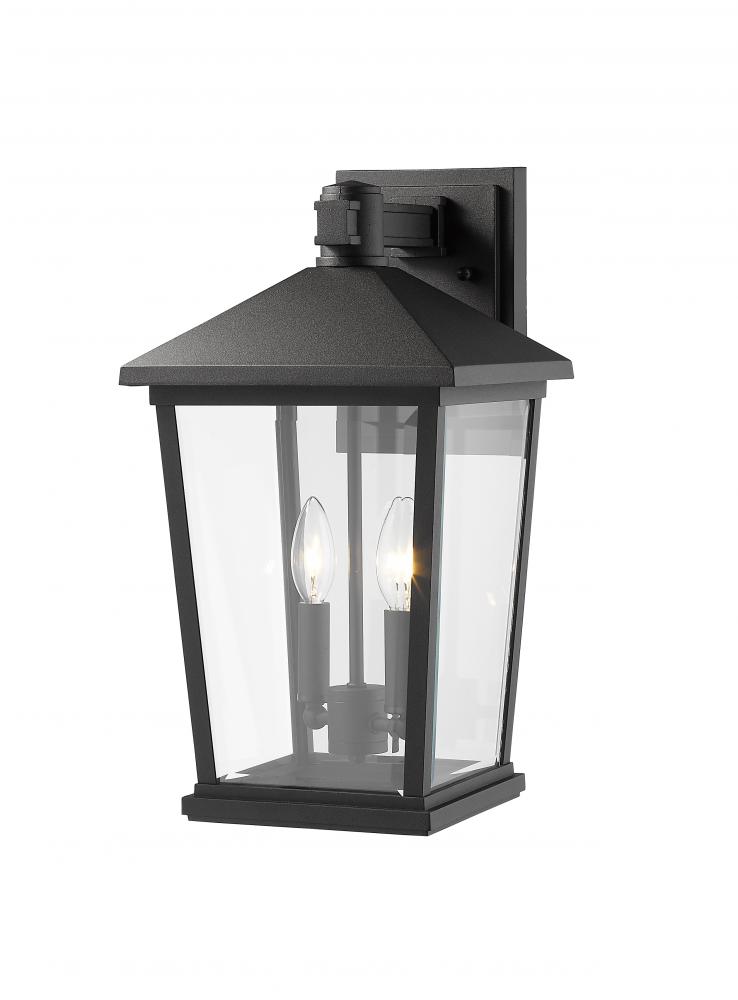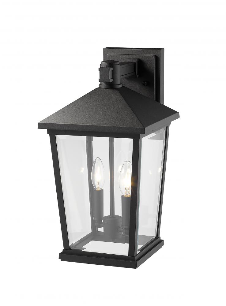 With a classic silhouette, this two-light outdoor wall light is great for illuminating a porch or walkway. The clean lines of the frame are streamlined with a sleek and modern black finish.