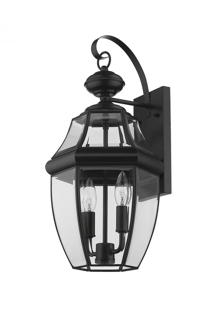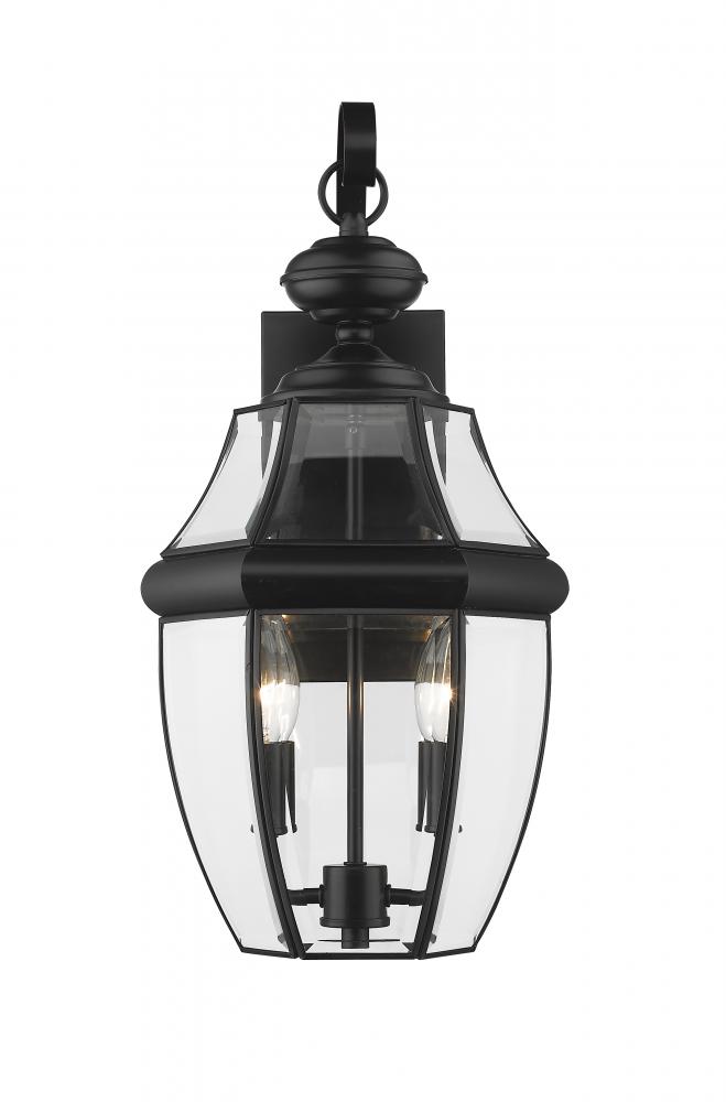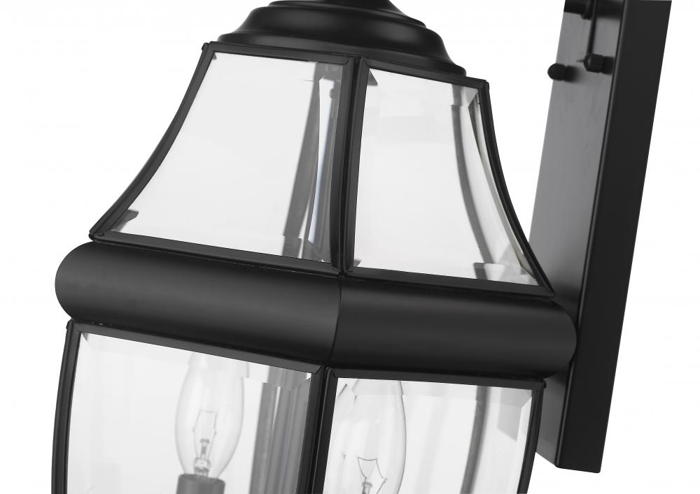 This two-light outdoor wall sconce adds a classic silhouette to the lighting in your patio, deck or porch area. With its candelabra composition, the sconce provides soft, effective illumination. A multi-sided clear beveled glass shade has a black steel frame, creating an elegant impression.