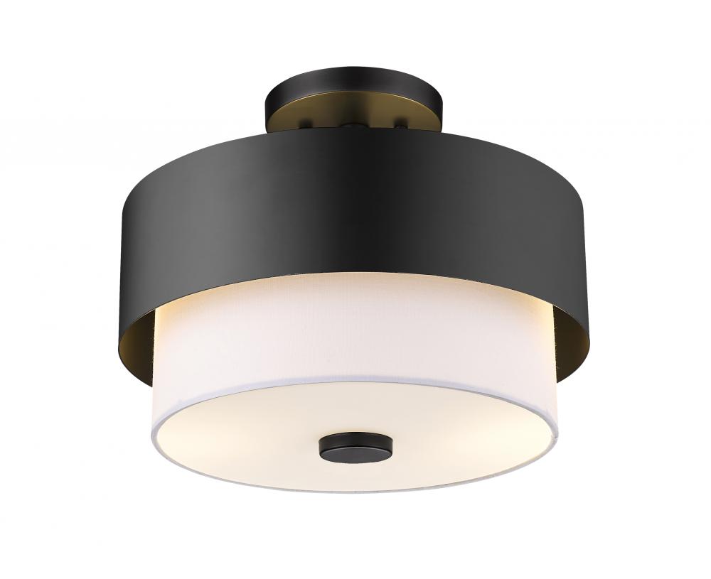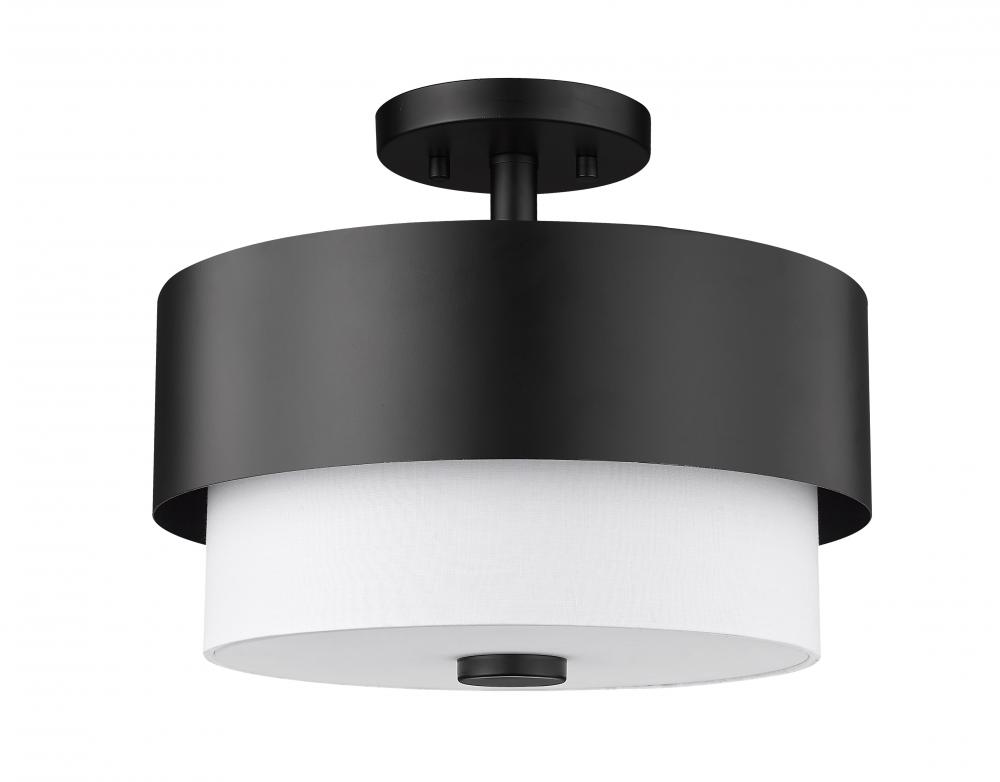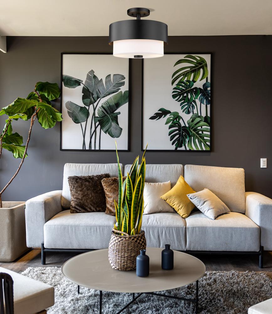 With a crisp contrasting finish palette that?s hard to miss, this Mid-Century Modern inspired semi-flush mount ceiling light draws focus upwards and delivers a sharp, clean look in a contemporary or transitional space. This two-light fixture from the Counterpoint collection reflects a cheerful round silhouette with a matte black metal frame and a soft white fabric shade. Call on a delightful and outspoken look to meet trending design aesthetics infusing ambient lighting in a kitchen, living area, or foyer.