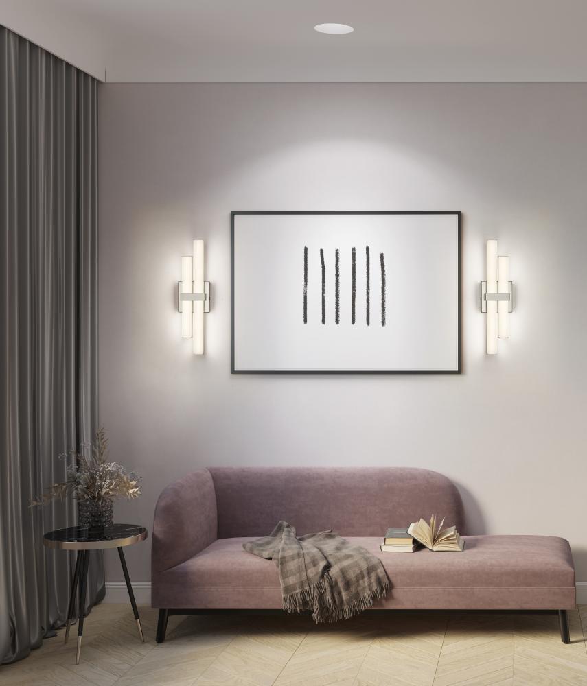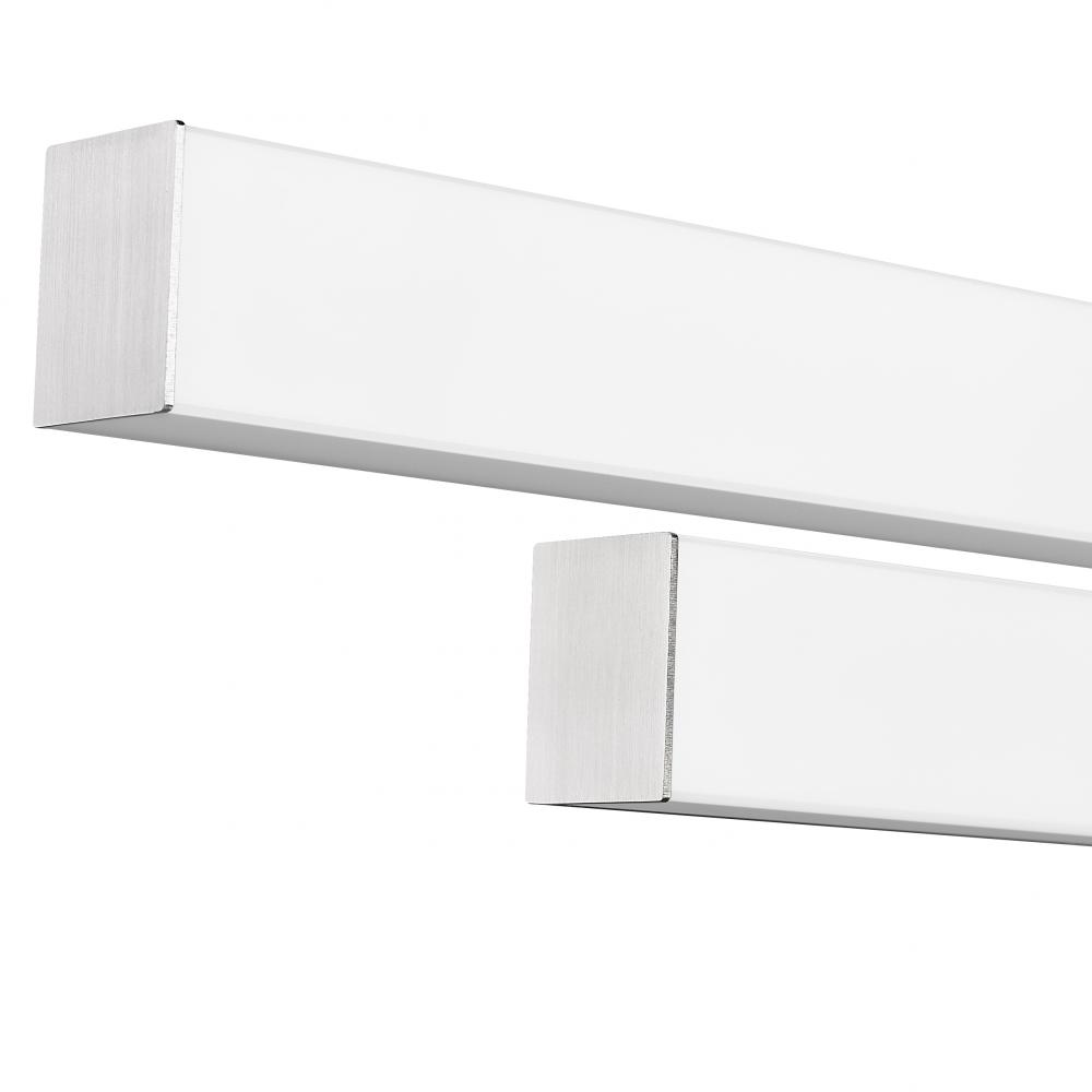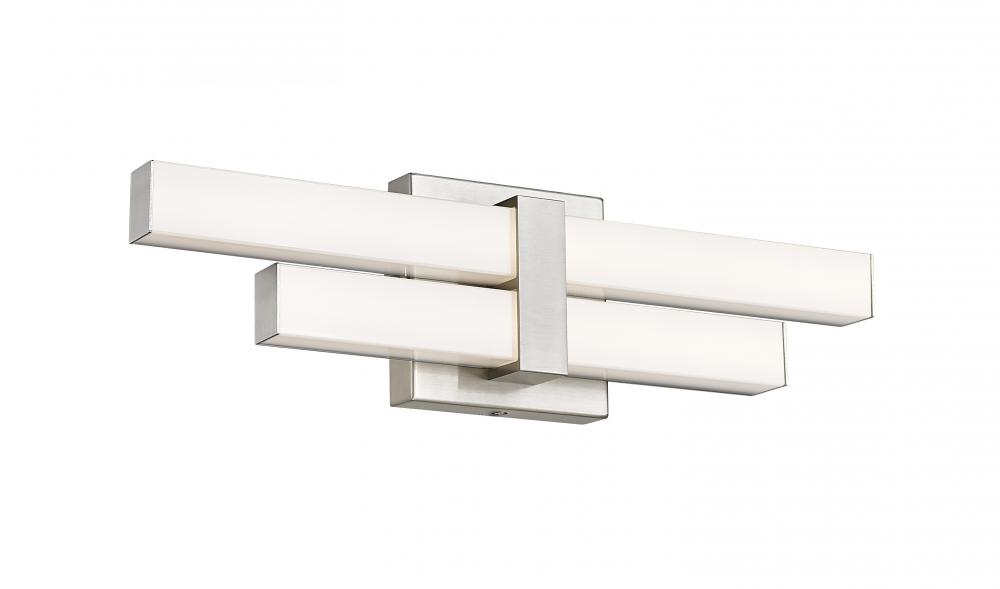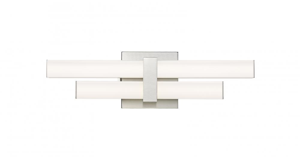Geometry and minimalism play well together in the crisp, modern design of this two-light vanity light, an intriguing way to illuminate a bath space with compatible contemporary elements. Symmetry and balance collude in a fixture created of brushed nickel finish aluminum and a pair of bar diffusers forming a tapered silhouette, creating dimmable ambient lighting with customized white color values.