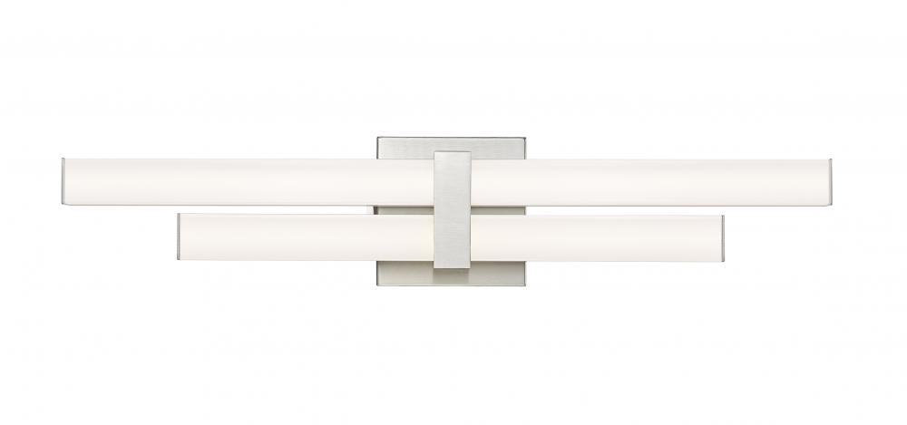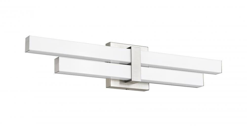 Structural in basic design standards, this two-light vanity light perks up bath spaces with a chic geometric flavor. Aluminum framing and accents offer a classic brushed nickel finish, as graduated frosted bar diffusers align vertically to emit dimmable LED lighting with a customized option of white color values.