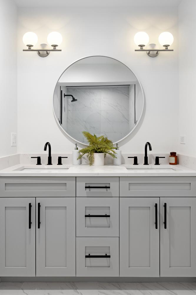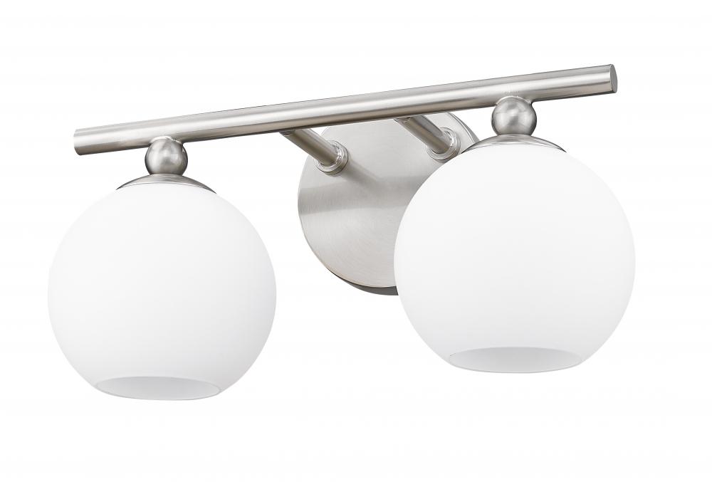 Make modern style work in an updated bath space with this two-light vanity light from the Neoma collection. Symmetry and a hint of festive retro influence blend to add an outspoken design aesthetic featuring side-by-side opal etched glass globe shades affixed to a minimalist frame made of brushed nickel finish steel. This contemporary vanity light transforms a master ensuite or guest bath into a haven for style.