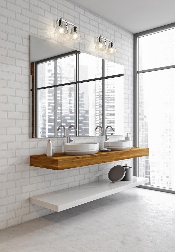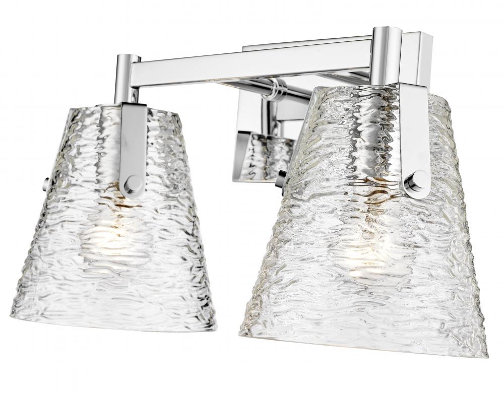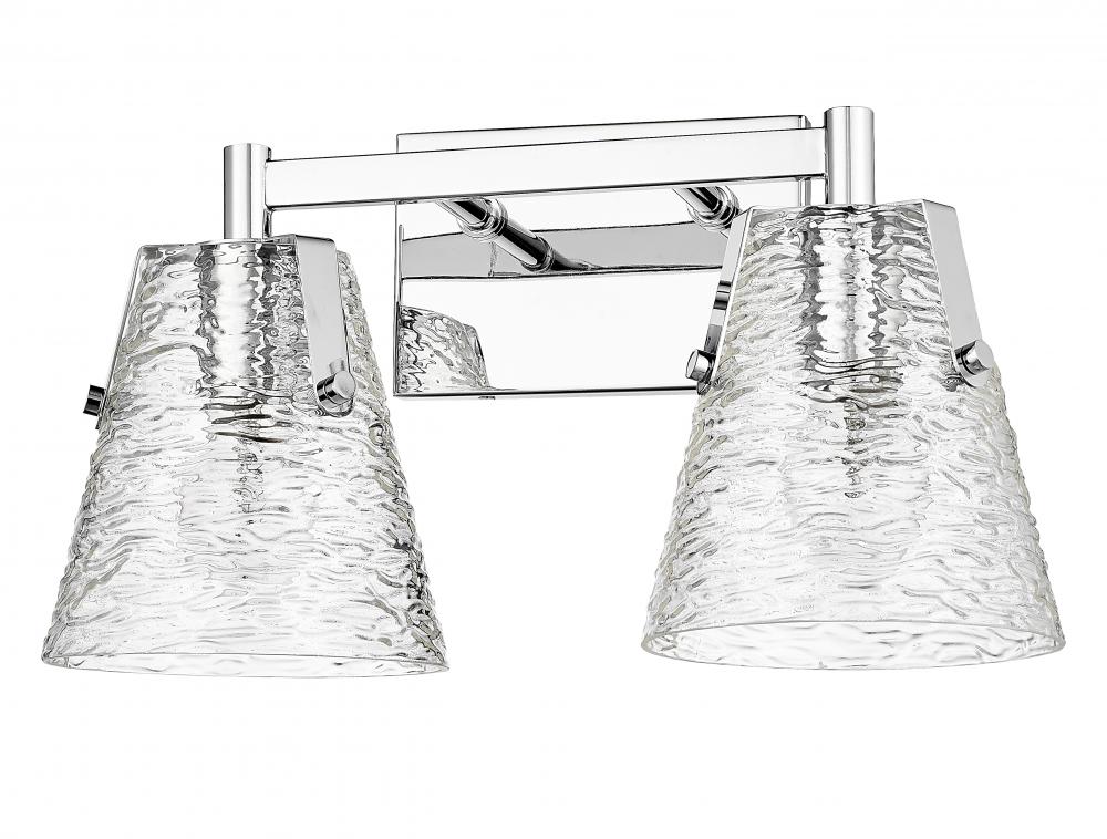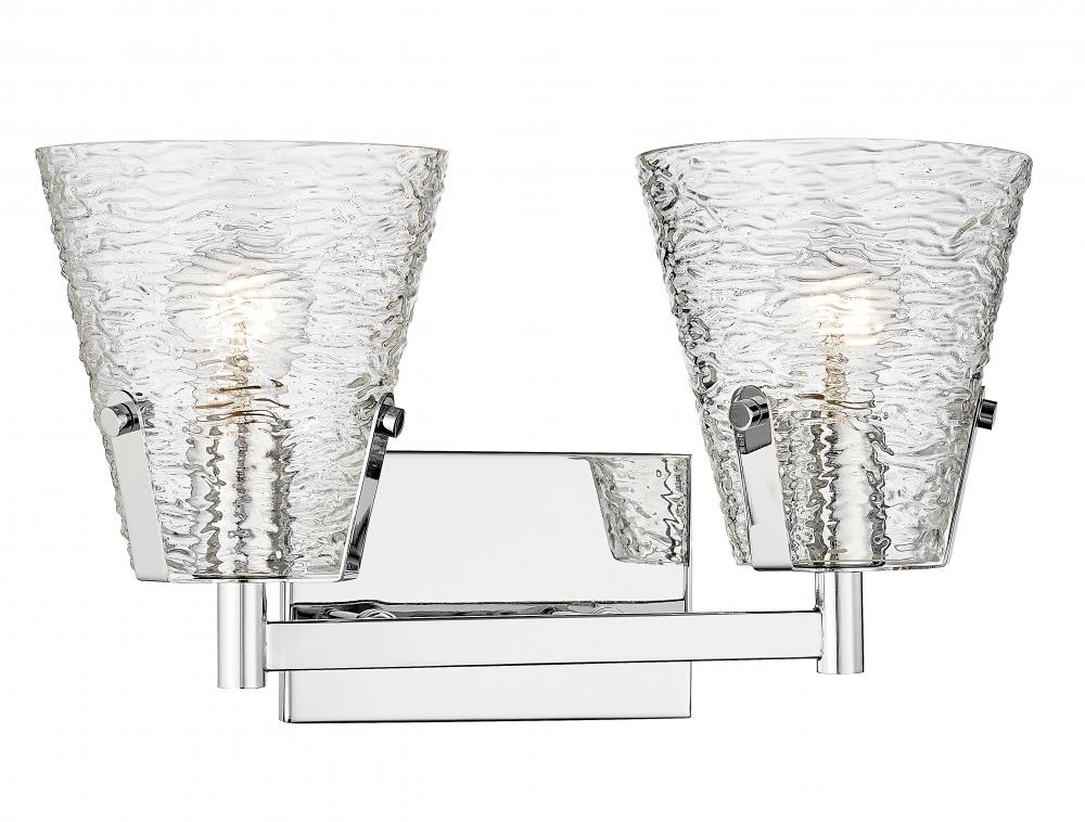 Conical shades made of clear textured glass kick off a design journey toward perfecting the custom look of an ensuite or guest bath space. From the Analia collection, this two-light vanity light is a great choice for contemporary or transitional bathrooms and hallways. Minimalism delivers order to a gleaming chrome finish steel frame offering versatility and sophistication.