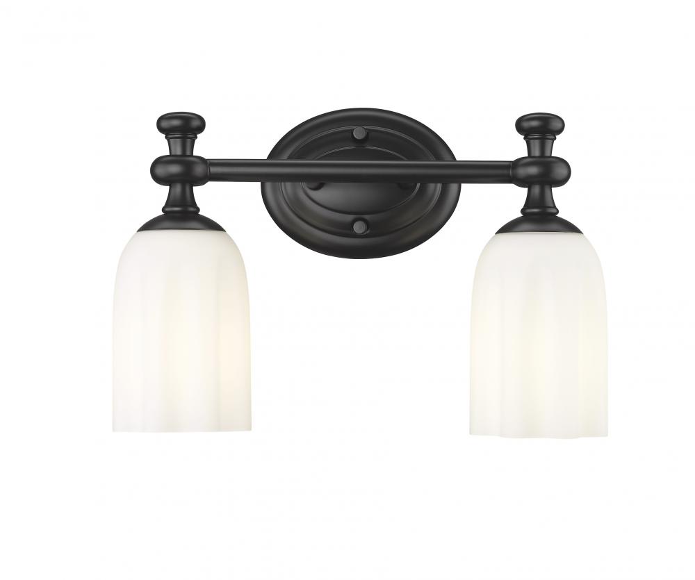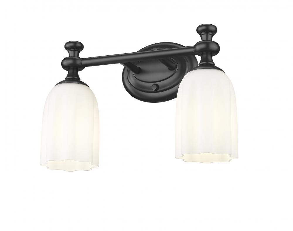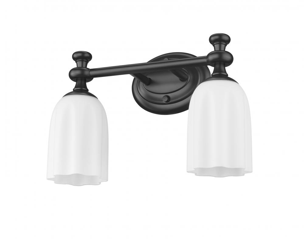 A pair of scalloped opal etched glass shades bring romantic elegance to a modern two-light vanity sconce. Designed for bright, diffused illumination, it pairs an oval wall plate with decorative arms and flourishes over its shades, offering eye-catching character at your vanity. A matte black finish is a lovely addition to steel construction, creating a strong, robust look and feel in your bath.