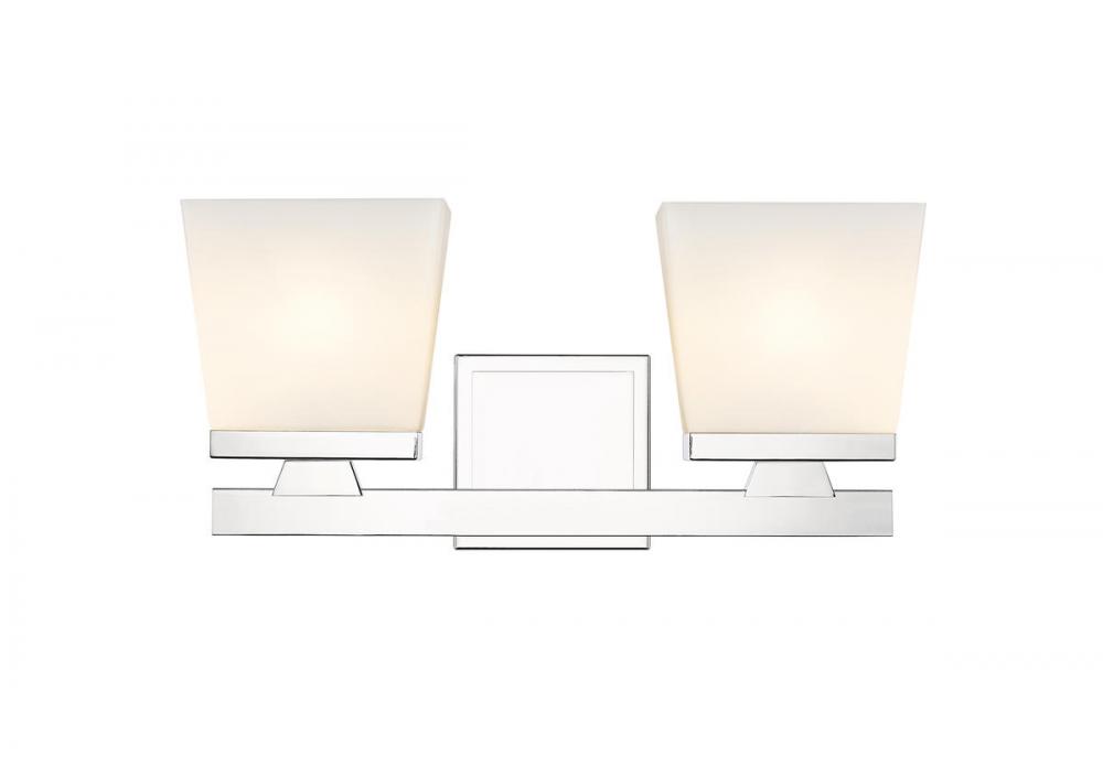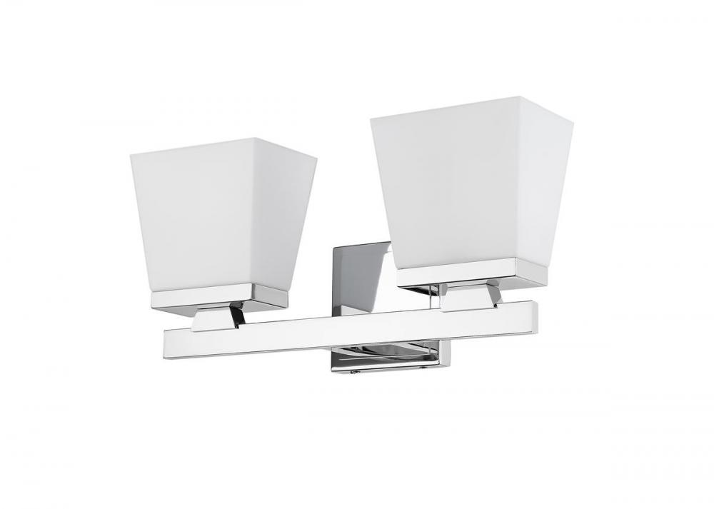 A modern farmhouse fixture with sleek lines, this two-light vanity boasts an etched opal glass shade. The fixtures steel construction is finished in chrome for a harmonious display in your bathroom or hallway.