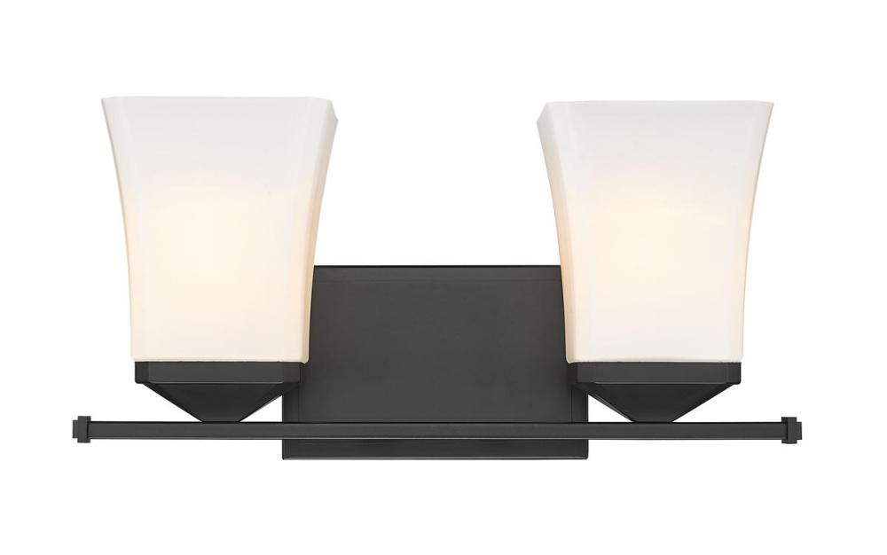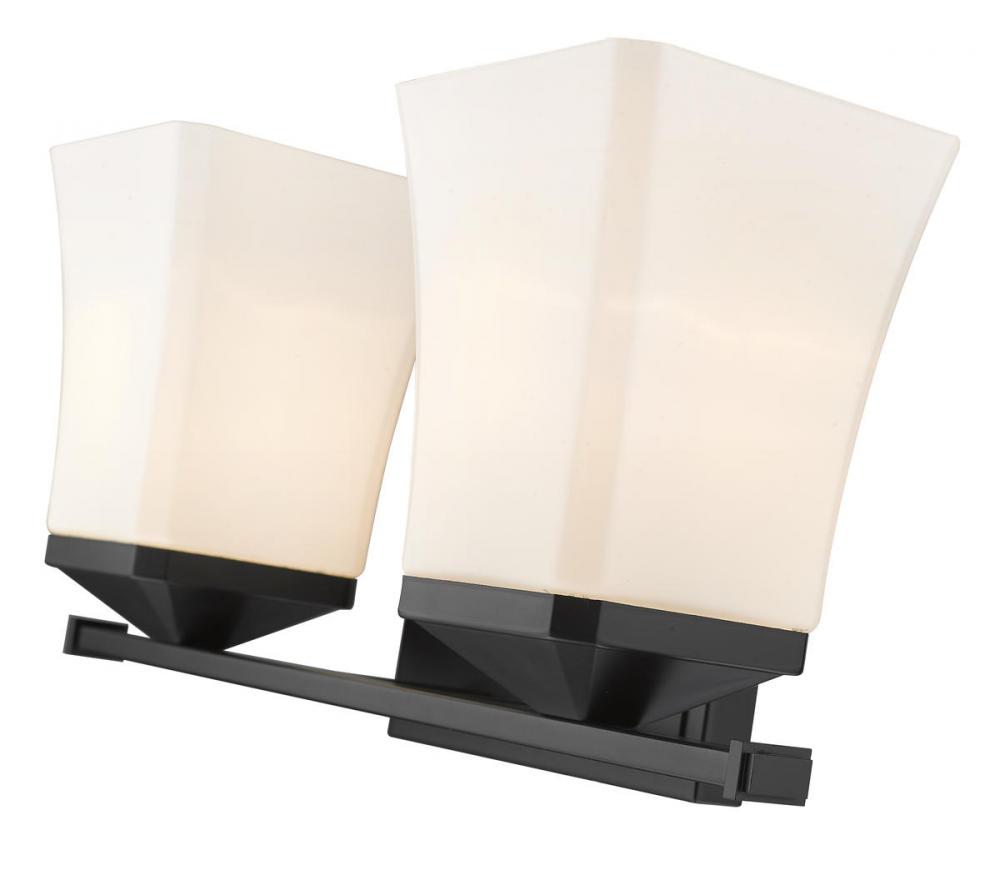Bring out the best in your bathroom with a two-light vanity featuring a matte finish and etched opal glass shades. Constructed from steel in a matte black finish.