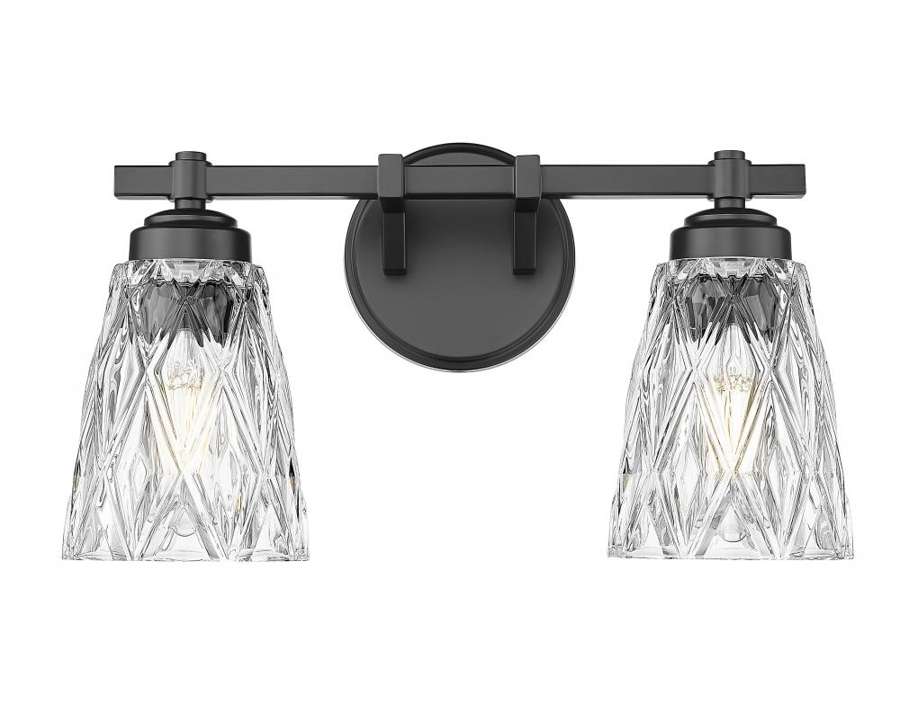 Embellish master or guest bath spaces with a high-class look in this two-light vanity light, a timeless reflection of glam style. Diamond patterning adds texture to a pair of clear glass shades, filtering dimmable lighting that adjusts to custom needs. Decorative matte black finish metal framing creates a sophisticated look ideal for both bath spaces and outer living areas.