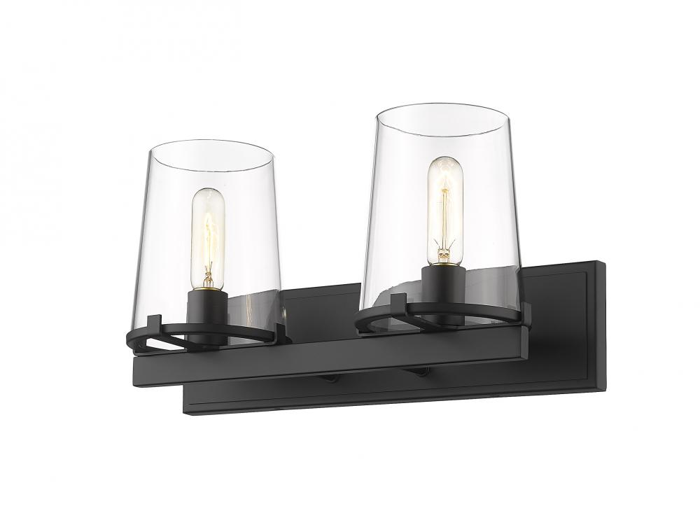 Dress up a transitional bath space with a fixture bridging modern elegance and nautical charm. The Callista two-light vanity light engages in clean linear design elements with a hand-crafted matte black finish steel frame and wall mount. A pair of delicate tapered clear glass shades composes an eye-pleasing silhouette that frames a bath vanity in sheer elegance.