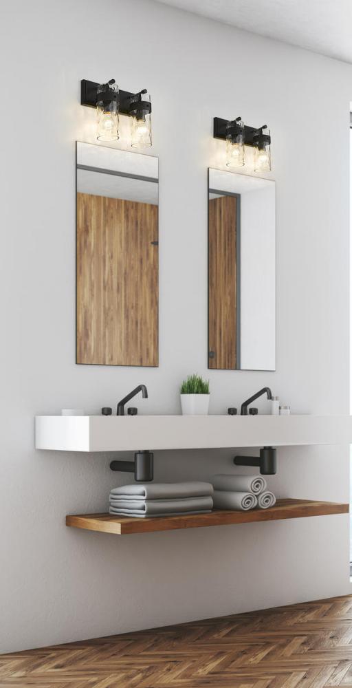 A clean, classic feel that blends with any decor, this two-light vanity fixture flaunts a brushed matte black finish and steel construction. The glass cylinder shade is enhanced with a ripple texture and ensures the perfect ambiance in hallways or bathrooms.