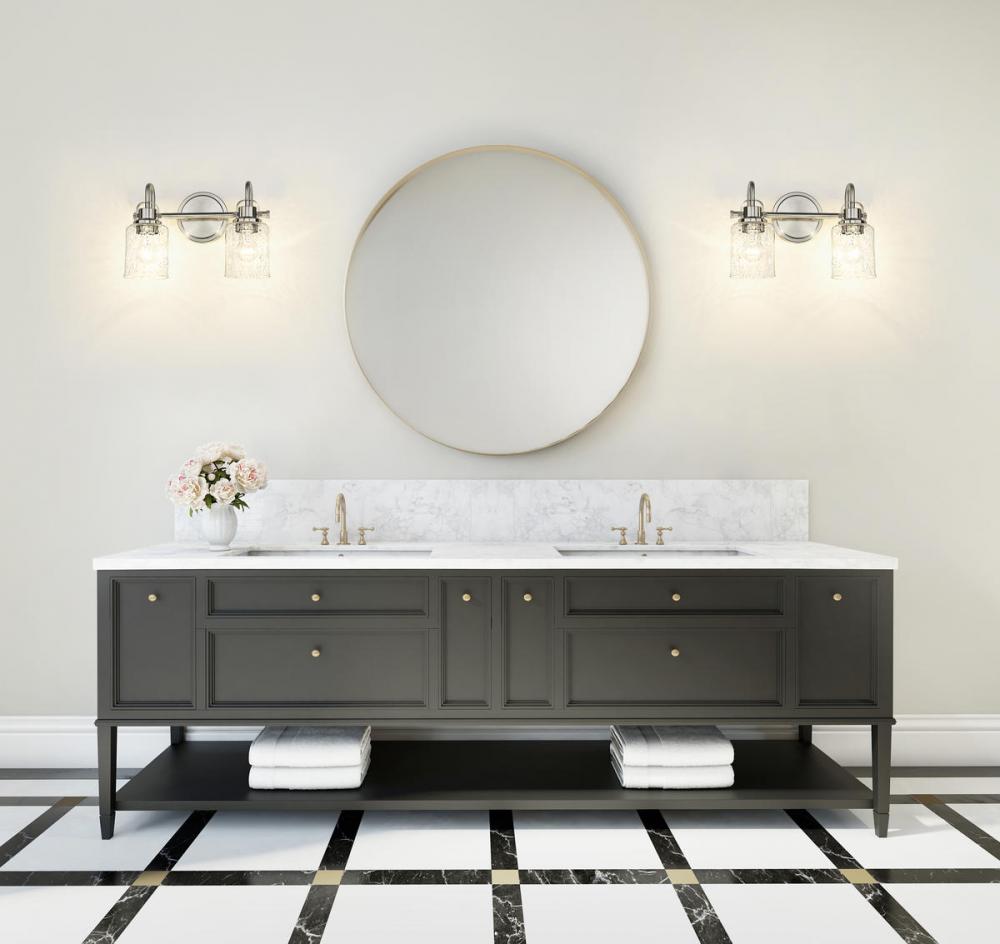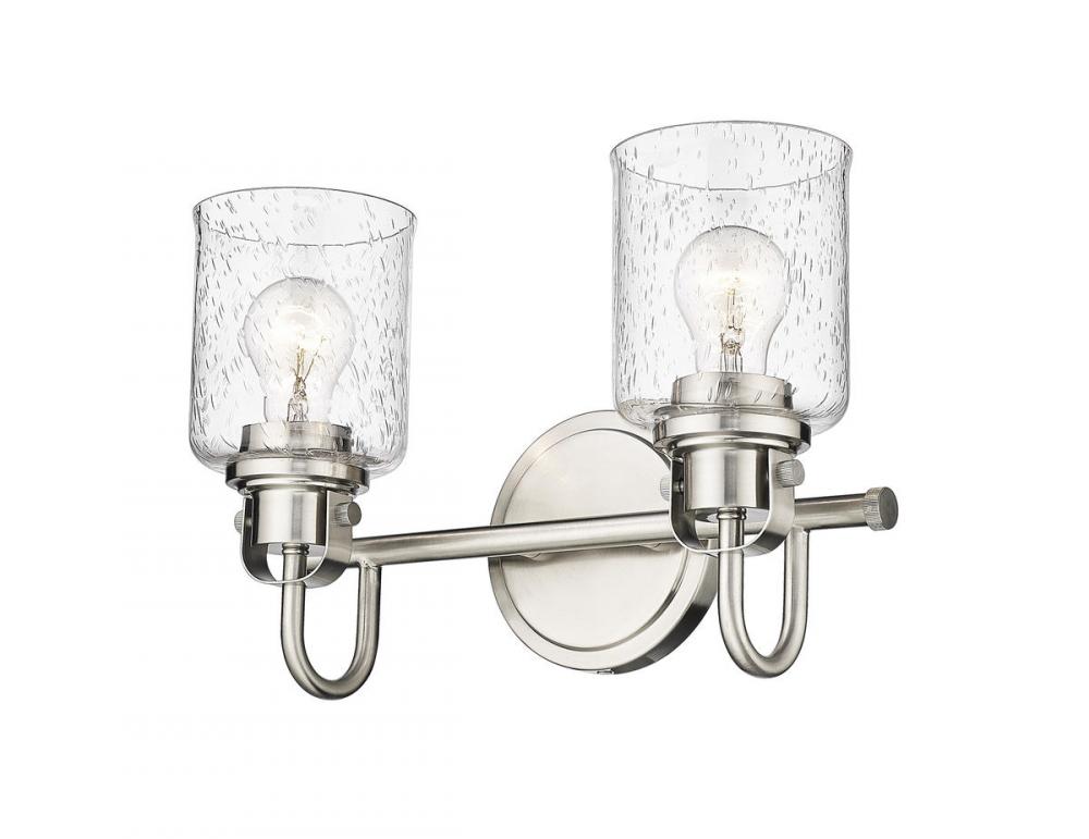 Urban and alluring, this brushed nickel two-light vanity fixture brings a pop of metropolitan flair to any hallway, bedroom or bathroom. Featuring steel construction with a clear seeded glass shade, this wall sconce provides optimal ambient lighting.