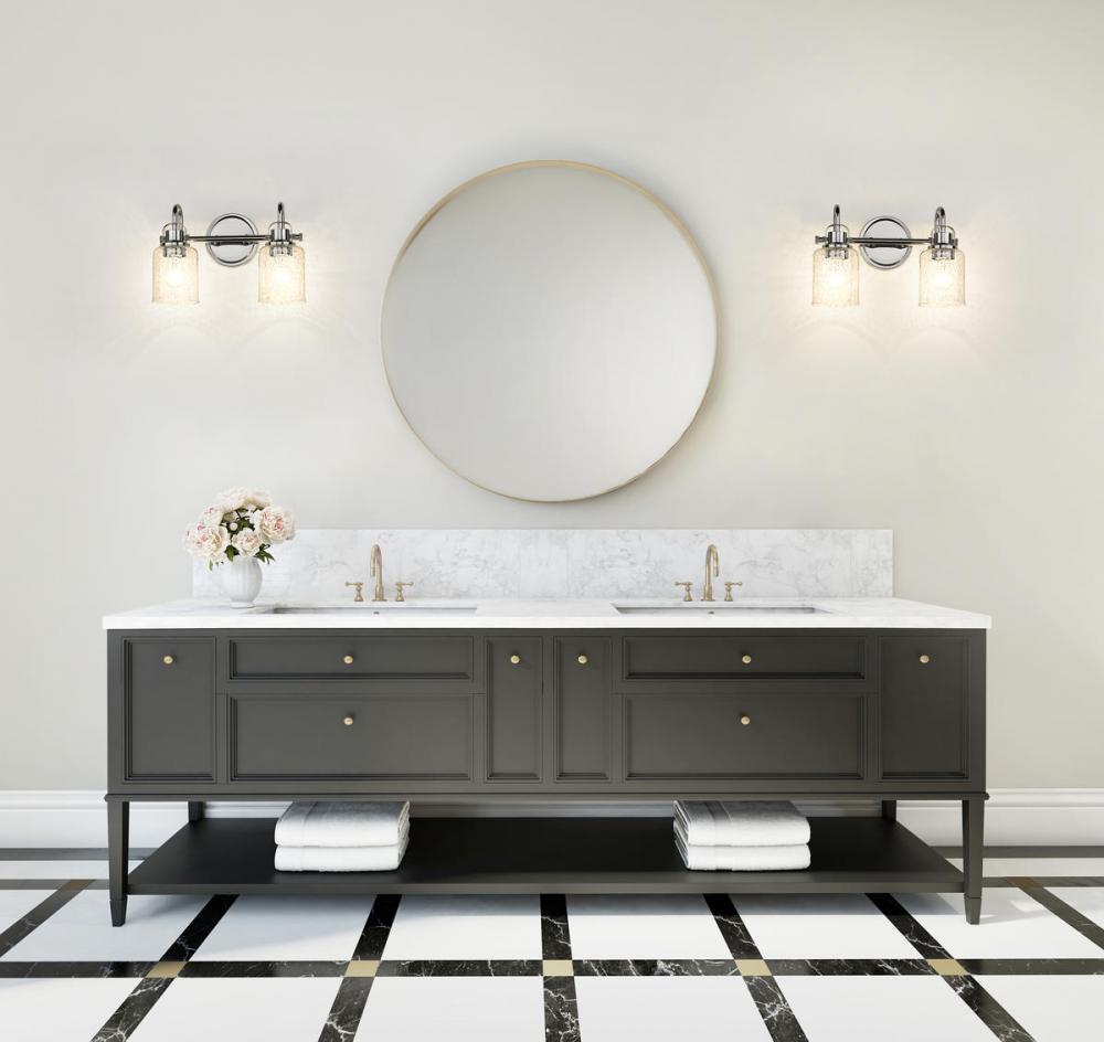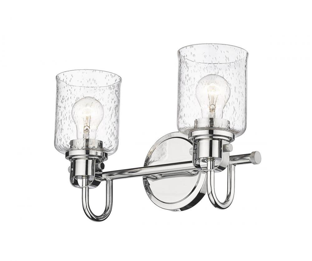 Urban and alluring, this chrome two-light vanity fixture brings a pop of metropolitan flair to any hallway, bedroom or bathroom. Featuring steel construction with a clear seeded glass shade, this wall sconce provides optimal ambient lighting.