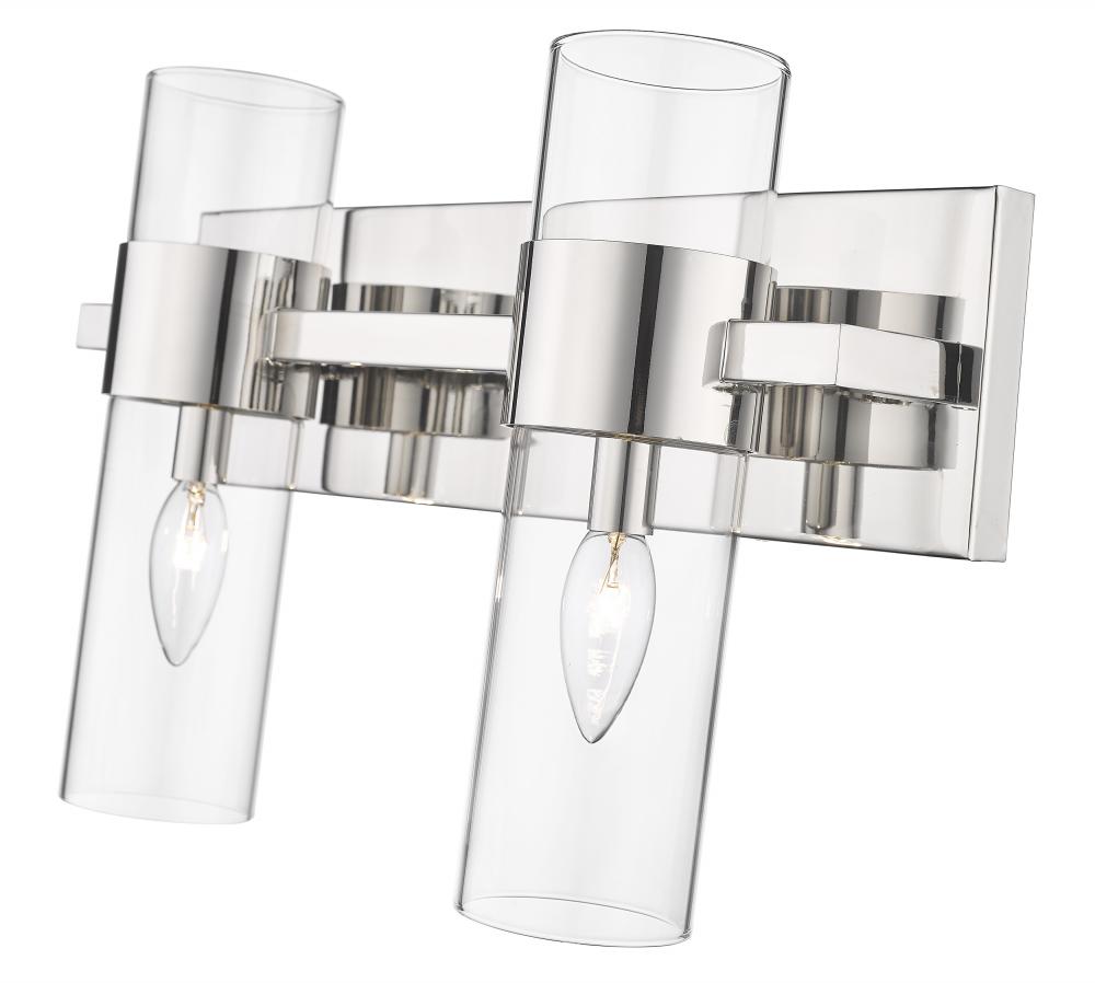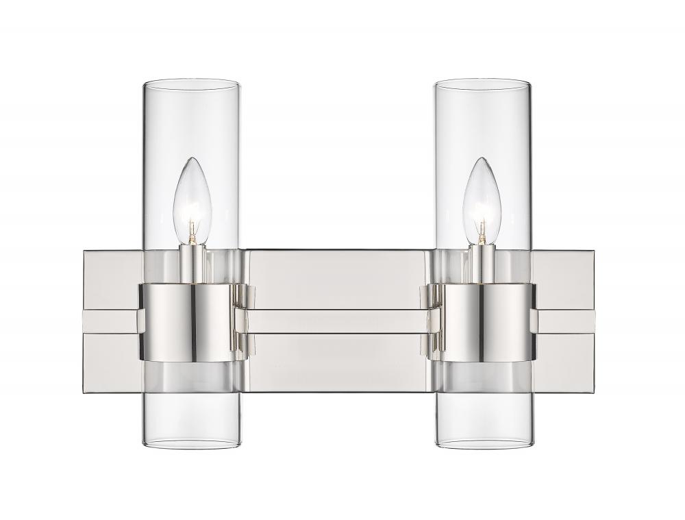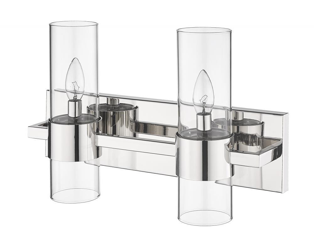 Sleek contemporary lines elevate this linear modern vanity light, illuminating bathroom countertops and powder room tablescapes with its minimalist flair. A long horizontal steel plate holds dual lights, each with a lantern-like clear glass cylinder shade clasped by a wide polished nickel ring, designed to add a metallic touch or complement existing bathroom hardware and fixtures. This contemporary double vanity light makes a striking addition mounted over a decorative mirror, providing ample glow and chic style to the space.