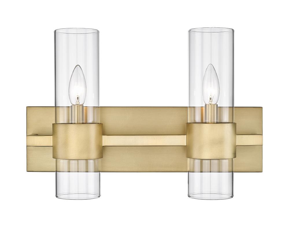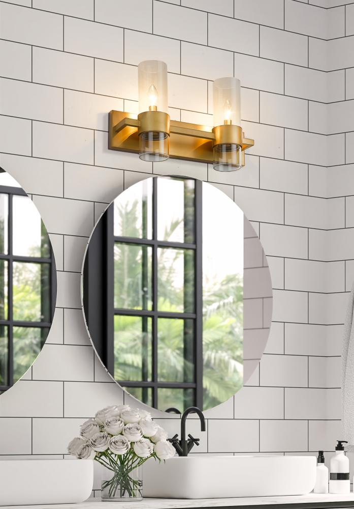 Sleek contemporary lines elevate this linear modern vanity light, illuminating bathroom countertops and powder room tablescapes with its minimalist flair. A long horizontal steel plate holds dual lights, each with a lantern-like clear glass cylinder shade clasped by a wide rubbed brass ring, designed to add a warm metallic touch or complement existing bathroom hardware and fixtures. This contemporary double vanity light makes a striking addition mounted over a decorative mirror, providing ample glow and chic style to the space.