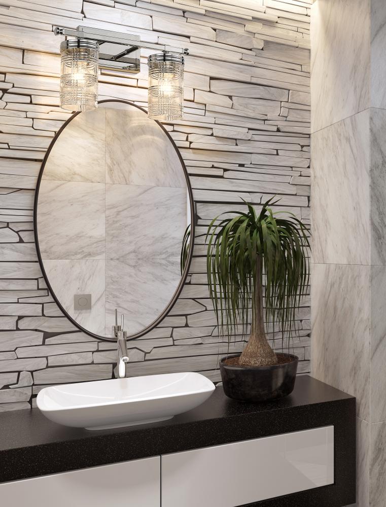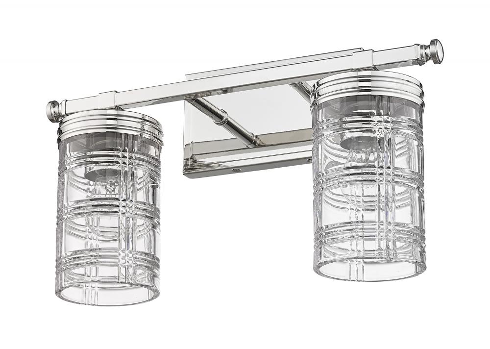 Adorn a traditional-leaning bathroom countertop vanity with this sophisticated, classically designed transitional two-light vanity wall sconce. With an old-world restoration flair, two cut crystal-inspired glass shades present a handsome Glen plaid pattern, creating a scintillated effect across countertops and walls. A lustrous polished nickel finish plate and caps complement cool tone metal fixtures and hardware, lending a timeless look to this metropolitan two-light vanity wall sconce, transforming bathroom interiors.
