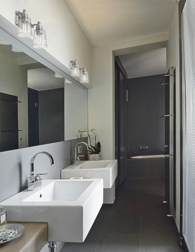 The heady effect of clear seedy glass brings a romantic touch to this brushed nickel finish two-light vanity light. Enjoy an elegance that comes from classic design detailing on its steel frame, and a versatile way to add extra illumination to a contemporary or transitional space.